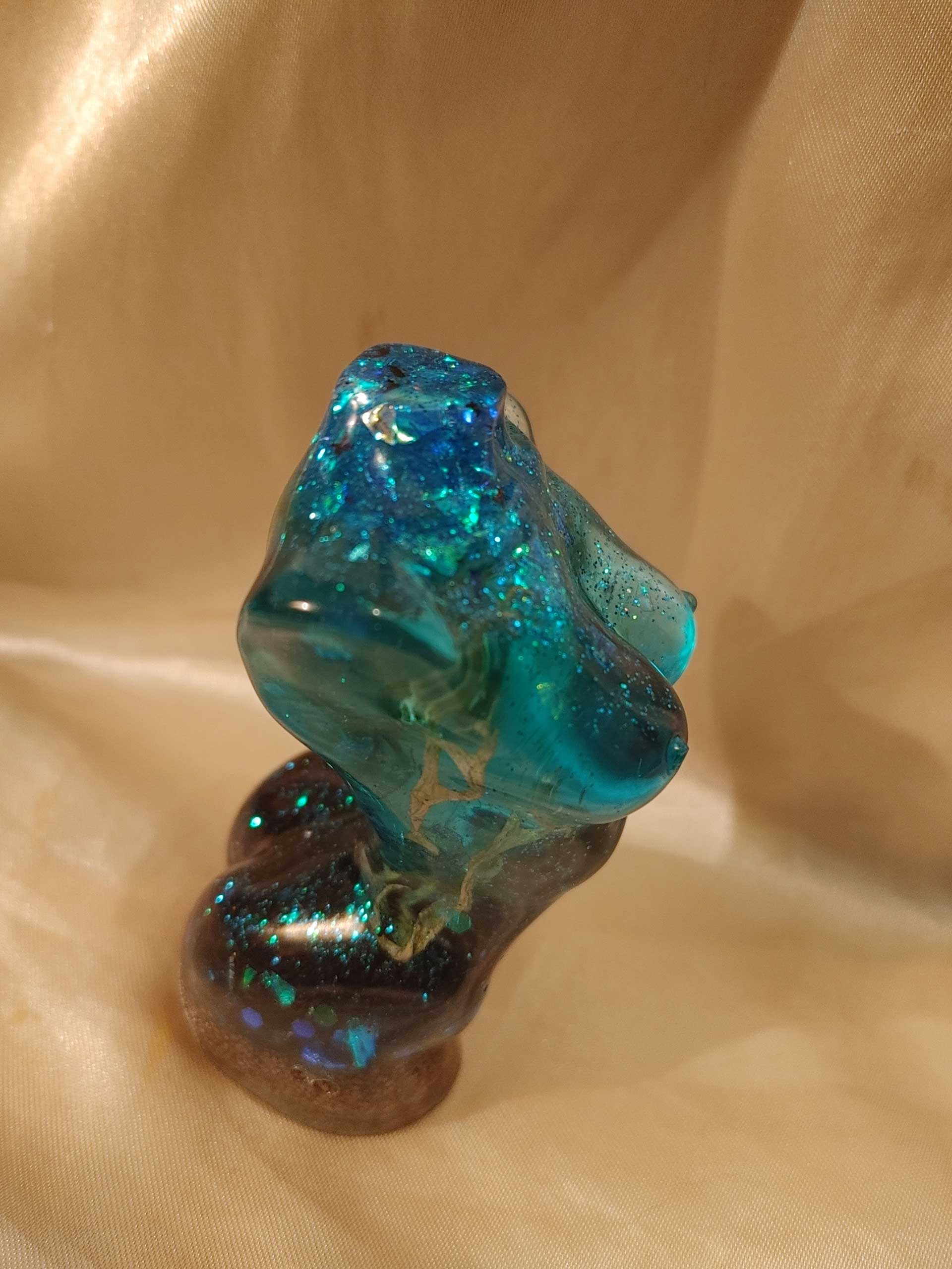 Molded clear resin figurine with embedded multi-coloured moss to represent coral, shells, sand and blue holographic glitter to mimic the mighty ocean.