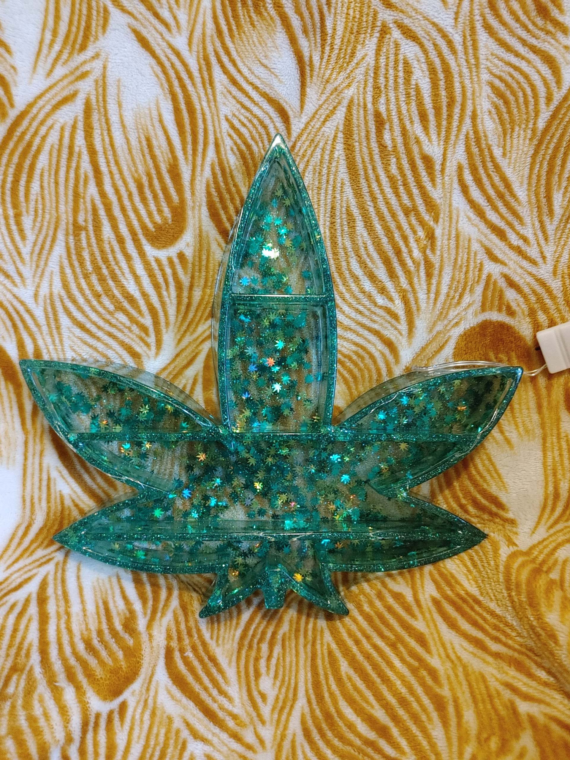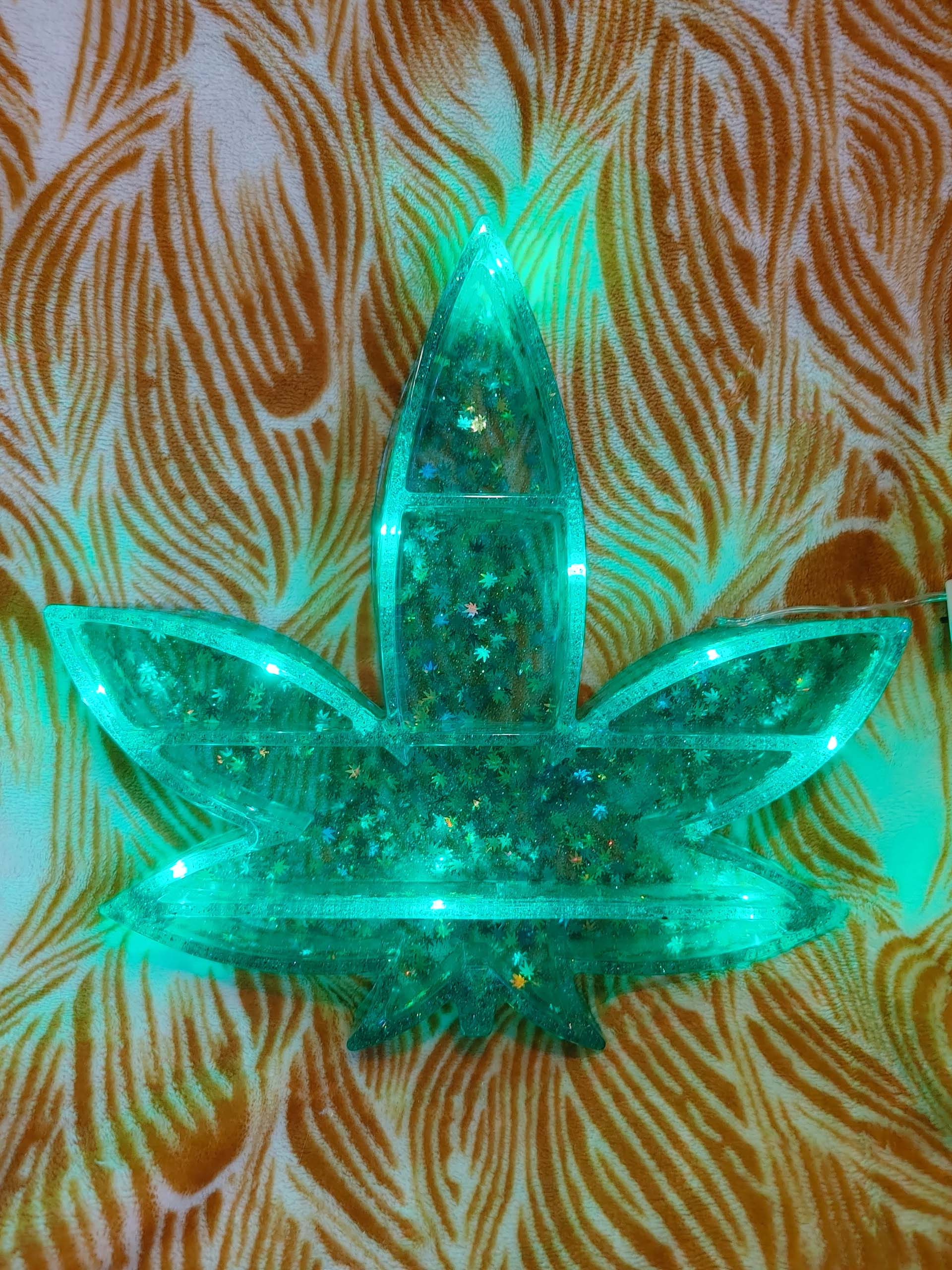 Molded resin with embedded marijuana leaf glitter. Green LED lights are encased in the resin with external on/off switch. Requires 1 CR2032 LITHIUM 3V button battery (included).