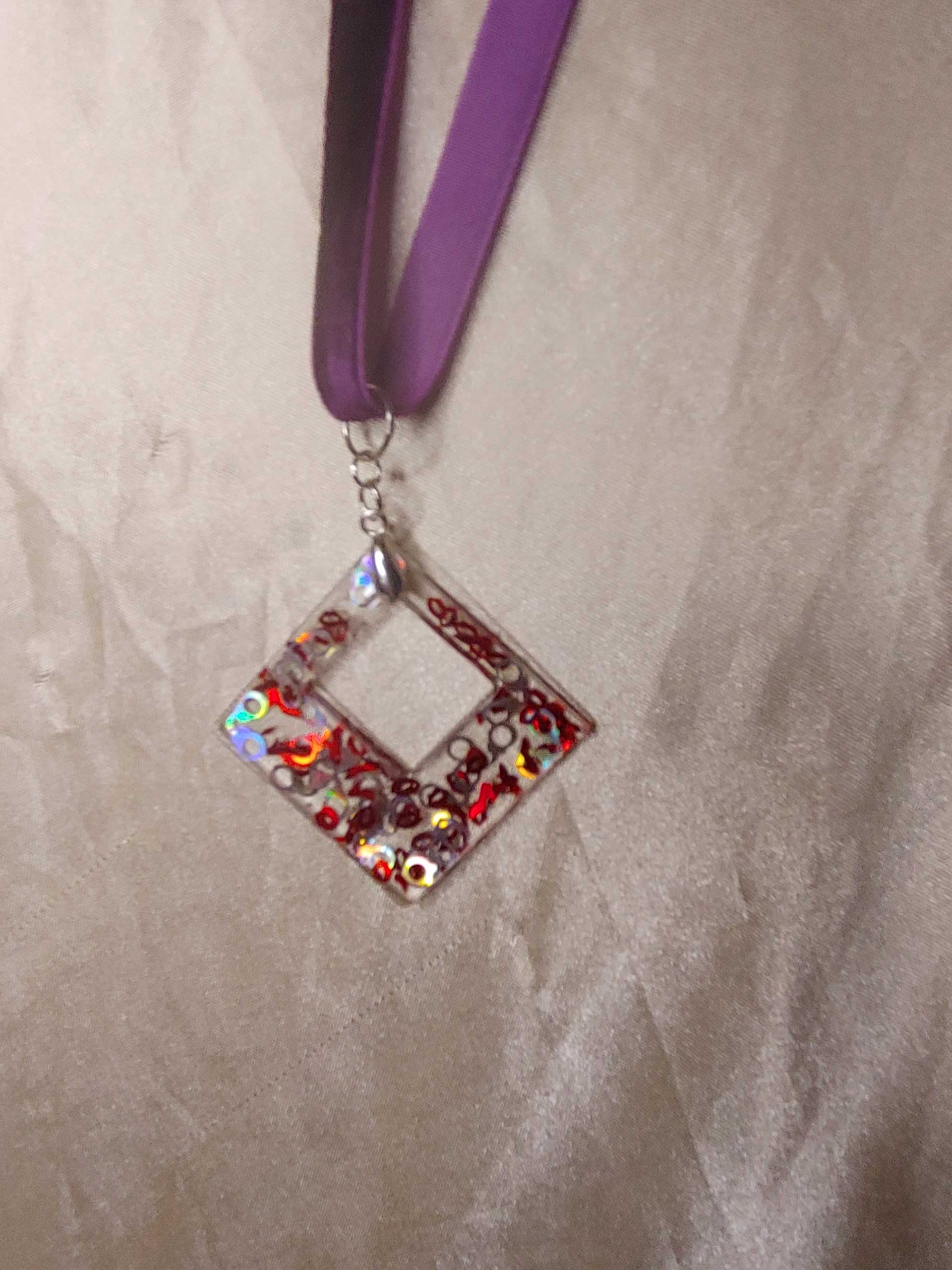 Choker style necklace features a purple velvet band and attached molded clear resin square/square cut-out pendant with embedded silver handcuffs, red lips and red high heel shoes glitters. Silver tone clasps.