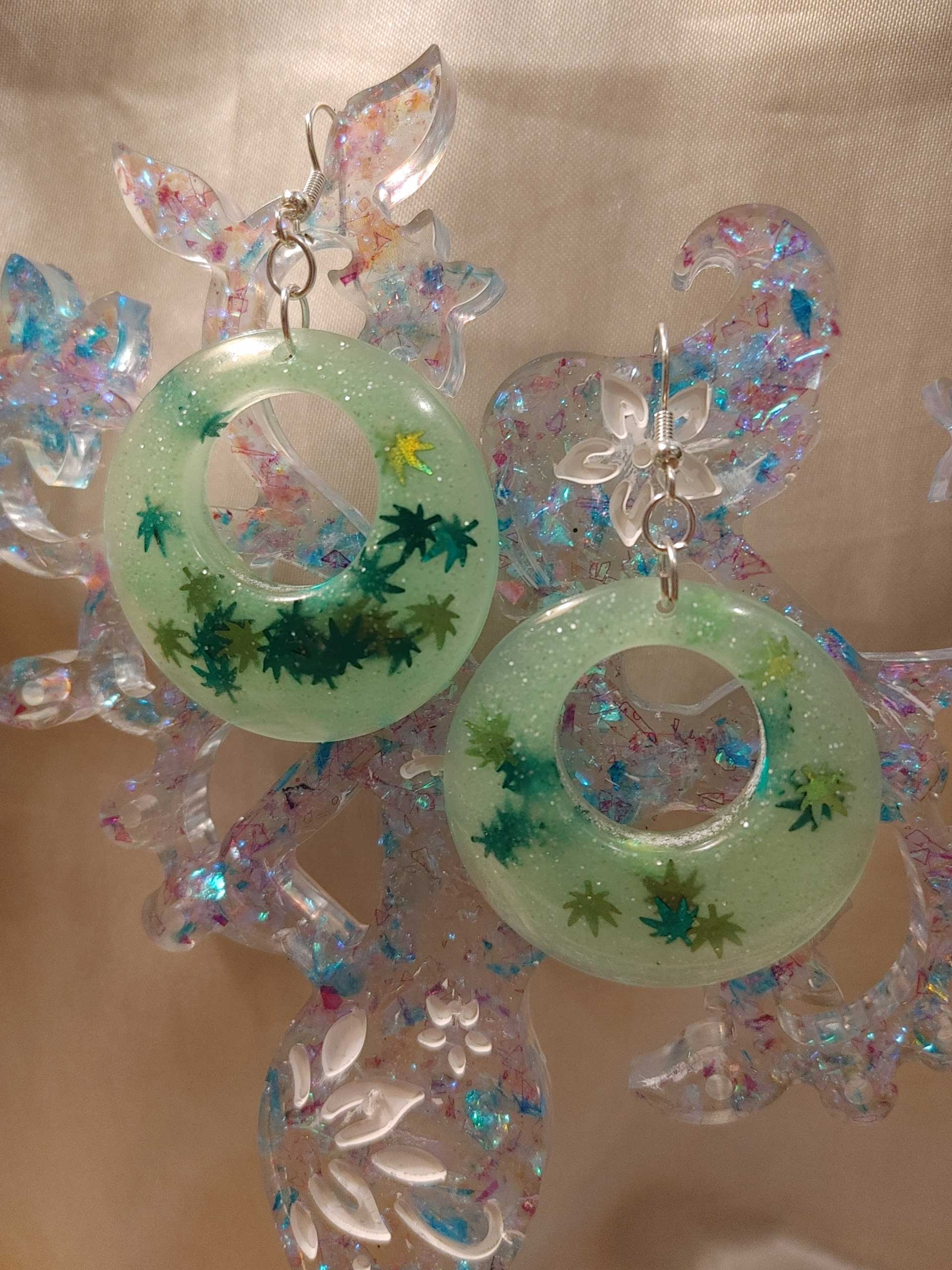 Chunky round/round cut-out drop style earrings (pair) for pierced ears. Molded resin with embedded green glow-in-the-dark and two tone green marijuana leaf glitter. Fish hook style posts.