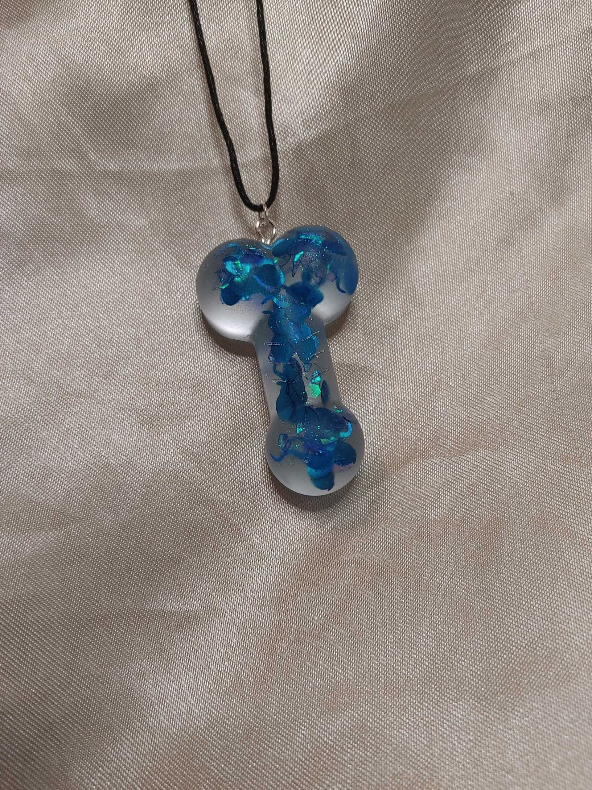 Molded resin pendant with embedded blue swimmers glitter and holographic flakes.