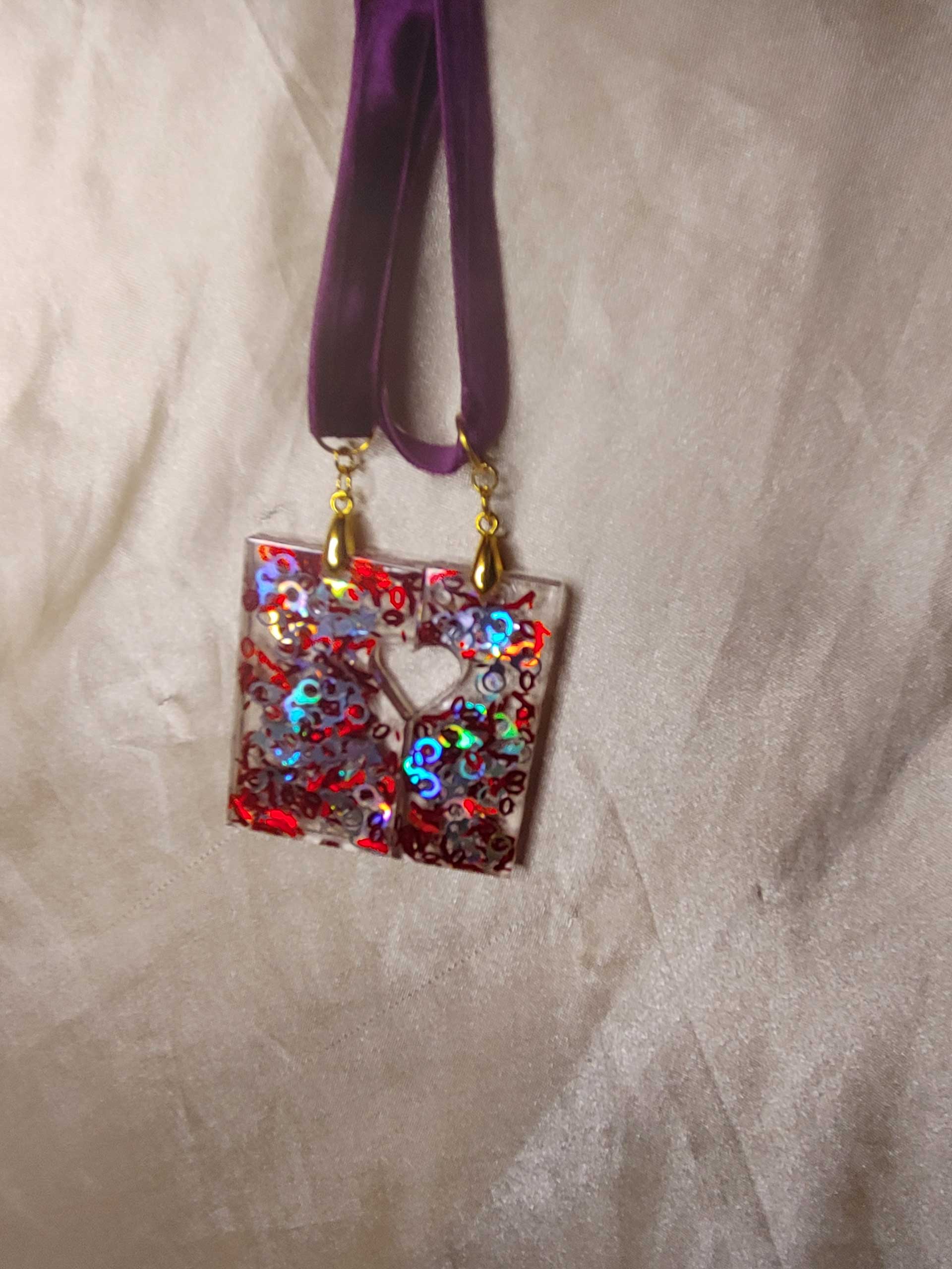 Molded clear resin half heart friendship pendant pair with embedded silver handcuffs, red lips and red high heel shoes glitters.. Each half heart is on its own purple velvet ribbon, ready for sharing with someone special. Gold tone clasps.