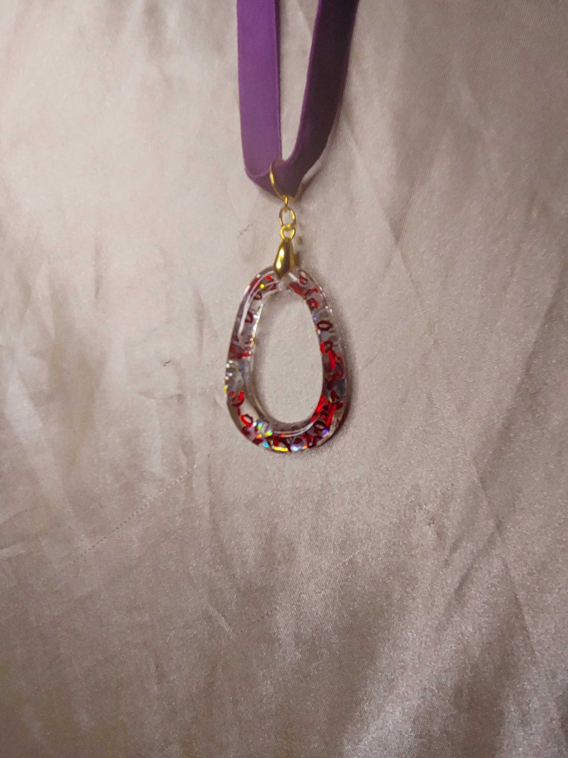 Molded clear resin oval/oval cut-out pendant with embedded silver handcuffs, red lips and red high heel shoes glitters on purple velvet ribbon. Gold tone clasps.