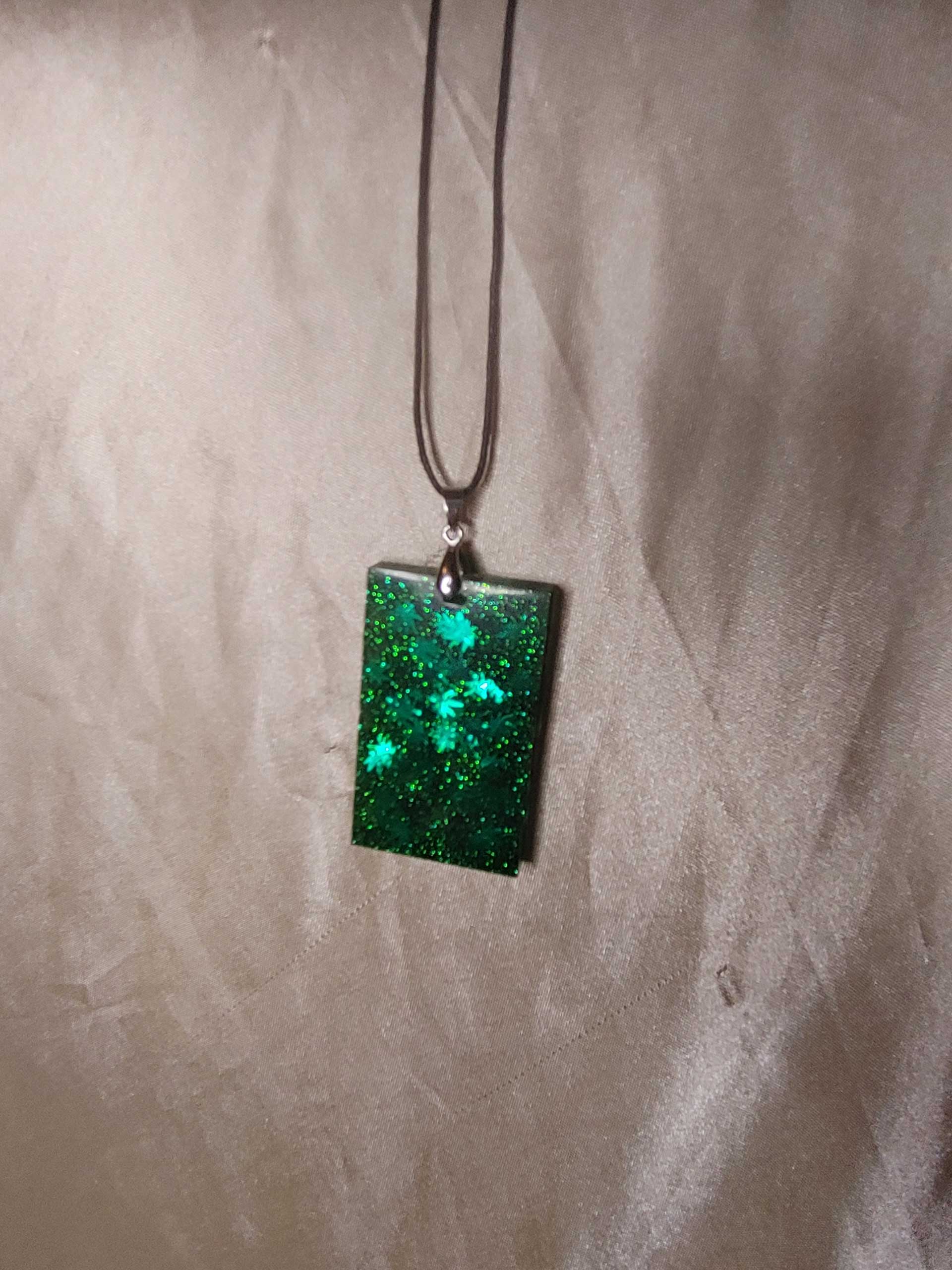 Molded clear resin pendant with embedded green leaf and fine green glitter. Silver tone clasps.