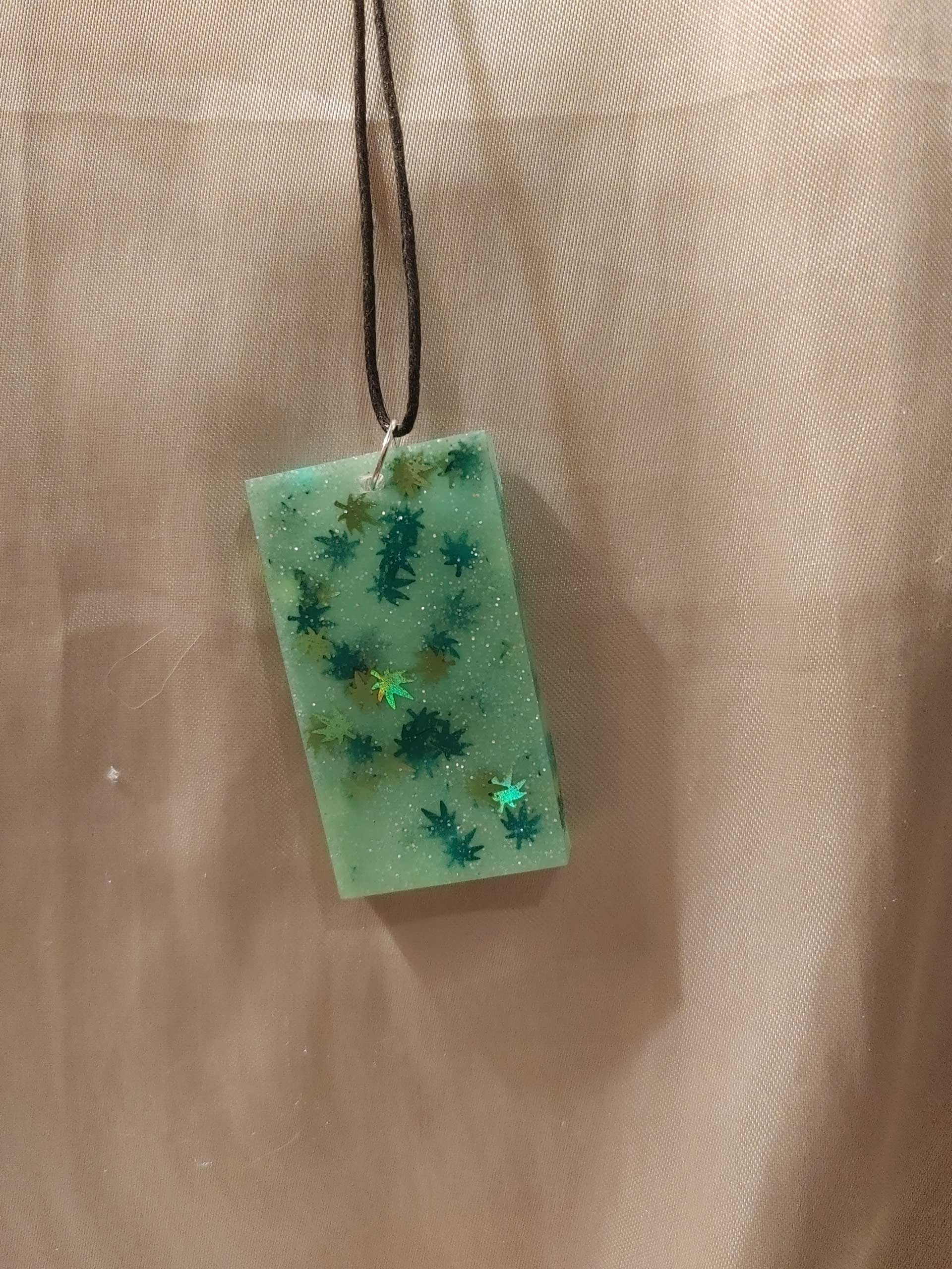 Molded resin pendant with embedded green glow-in-the-dark and two tone green marijuana leaf glitter. Silver tone clasps.