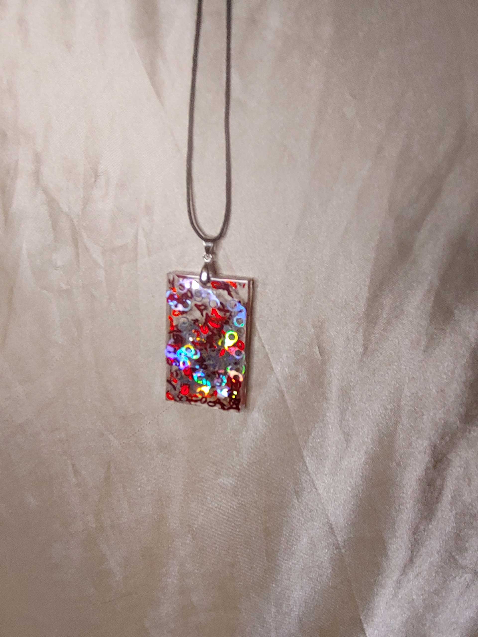 Molded clear resin pendant with embedded silver handcuffs, red lips and red high heel shoes glitters on purple velvet ribbon. Silver tone clasps.