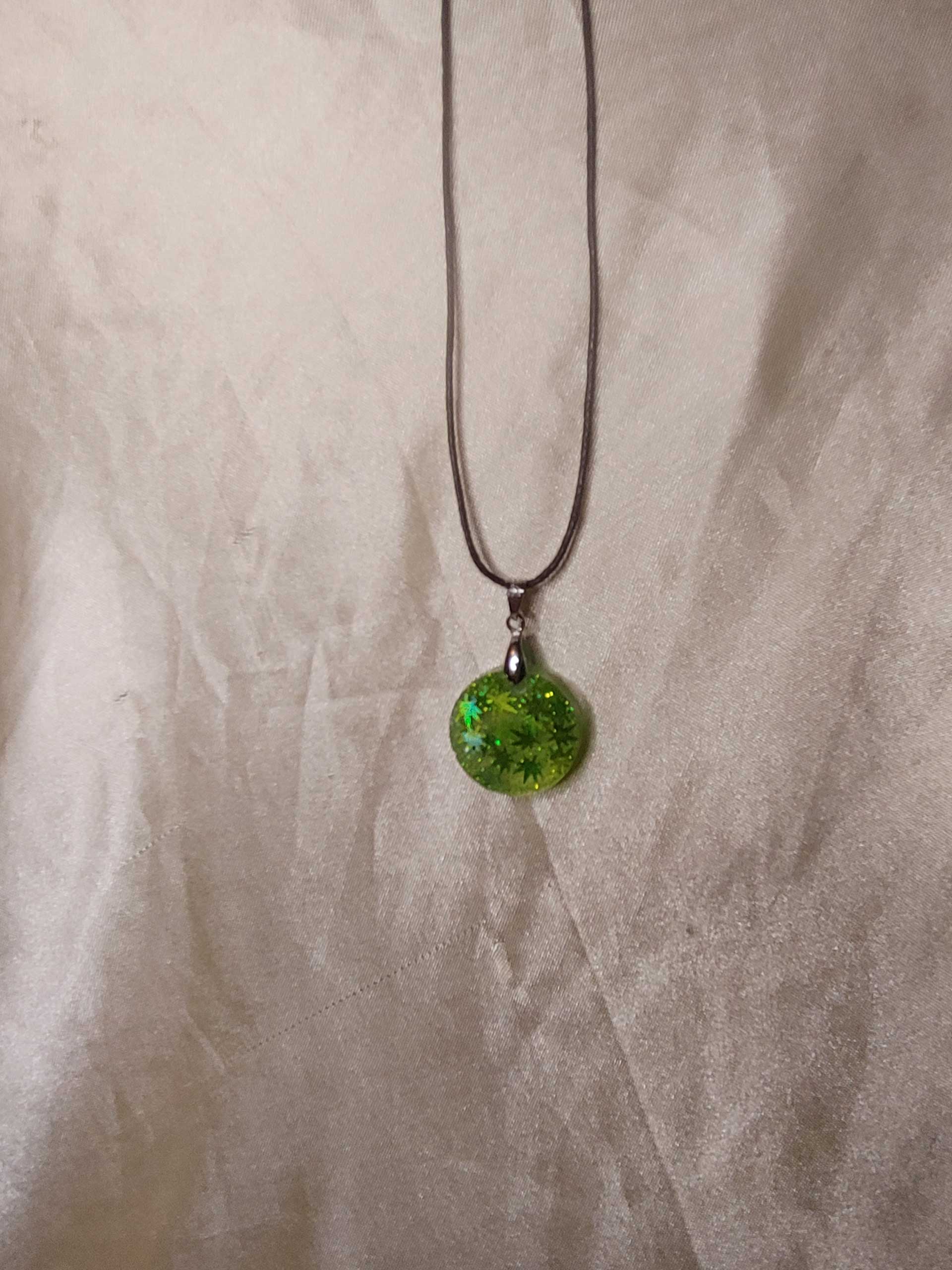 Molded clear resin pendant with embedded light green leaf and fine light green glitter. Silver tone clasps.