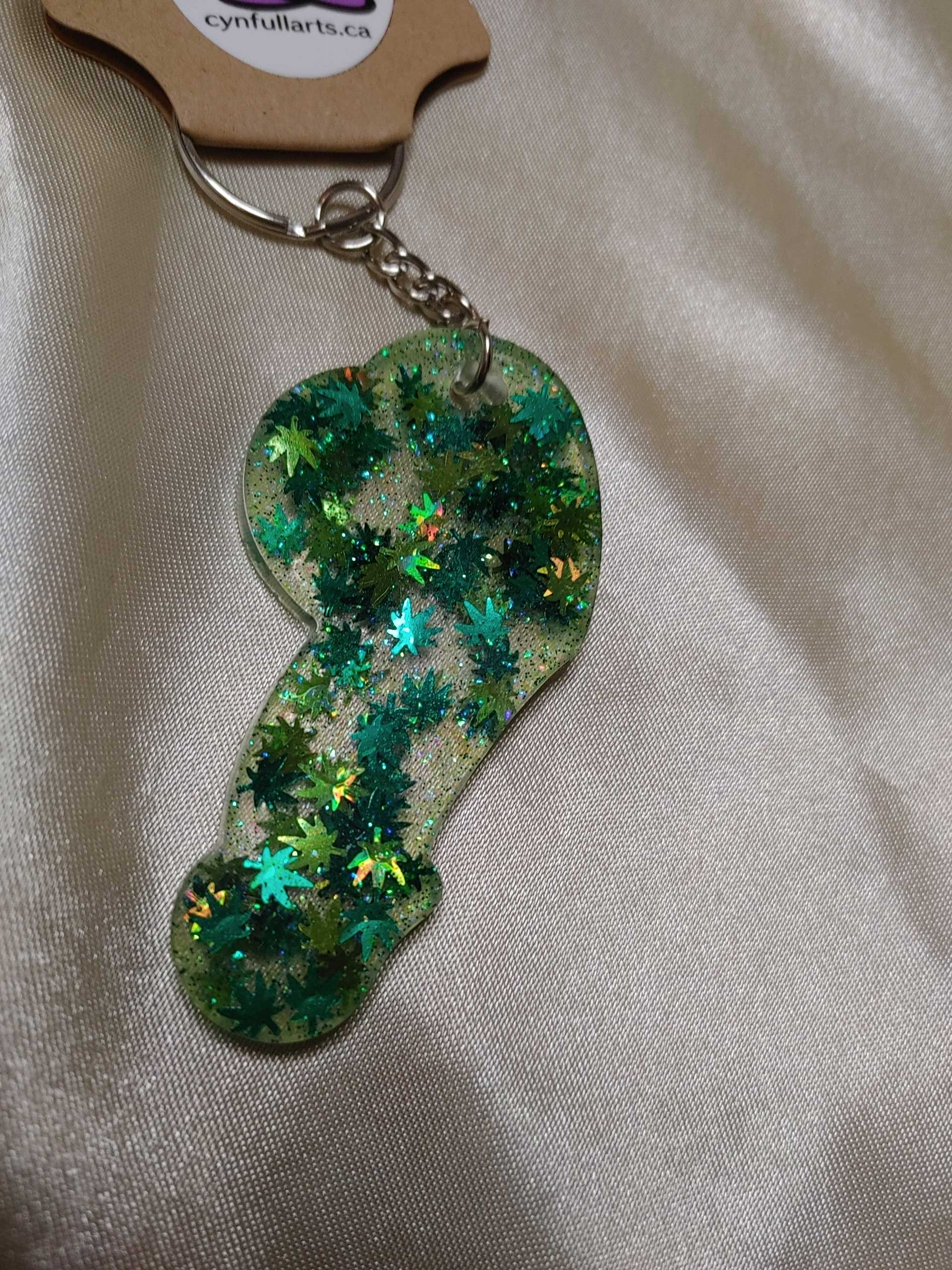 Molded clear resin fob with embedded green marijuana leaf glitter.