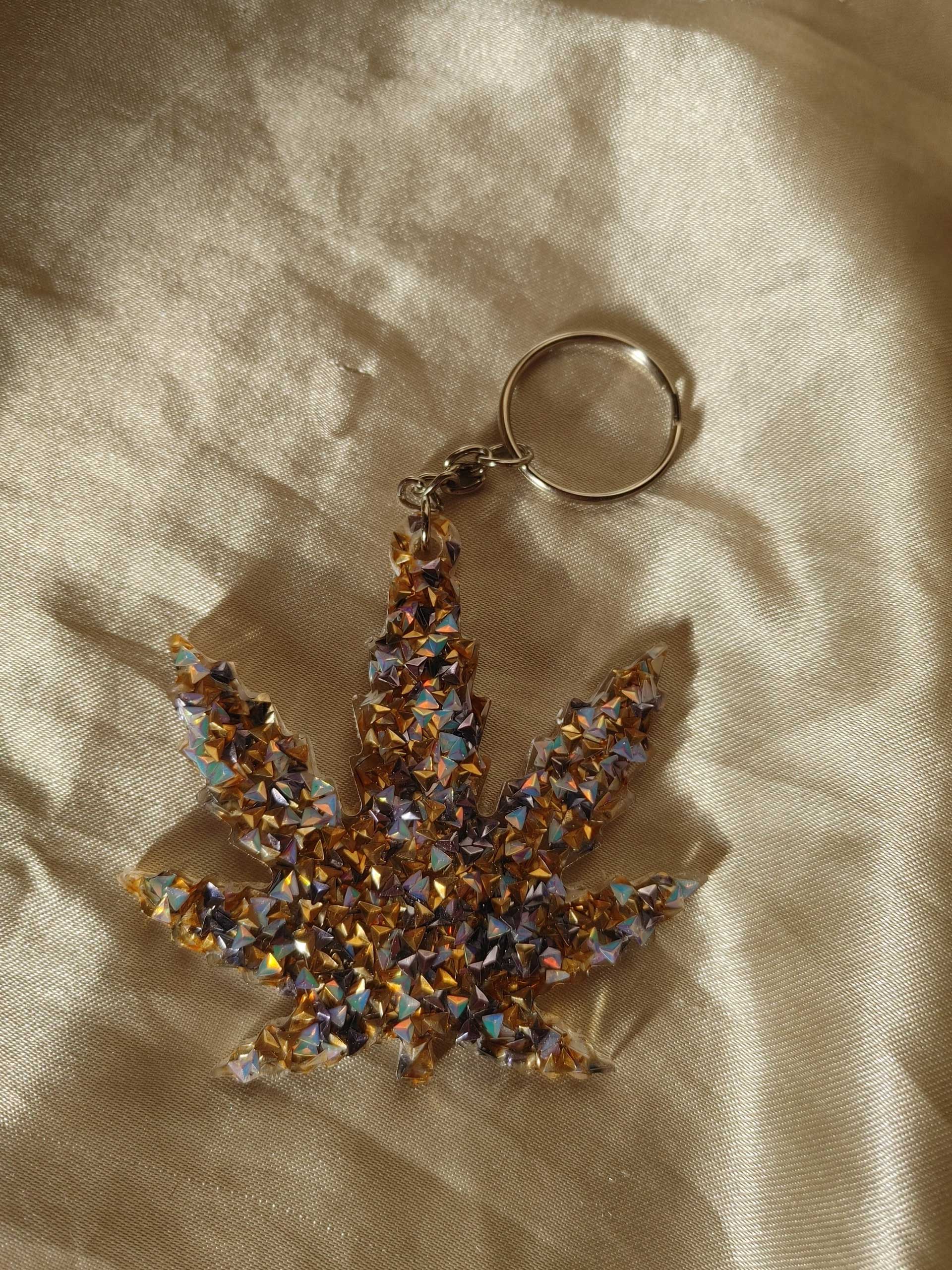 Molded resin marijuana leaf shape fob with embedded gold/white/purple 3D triangle glitter.
