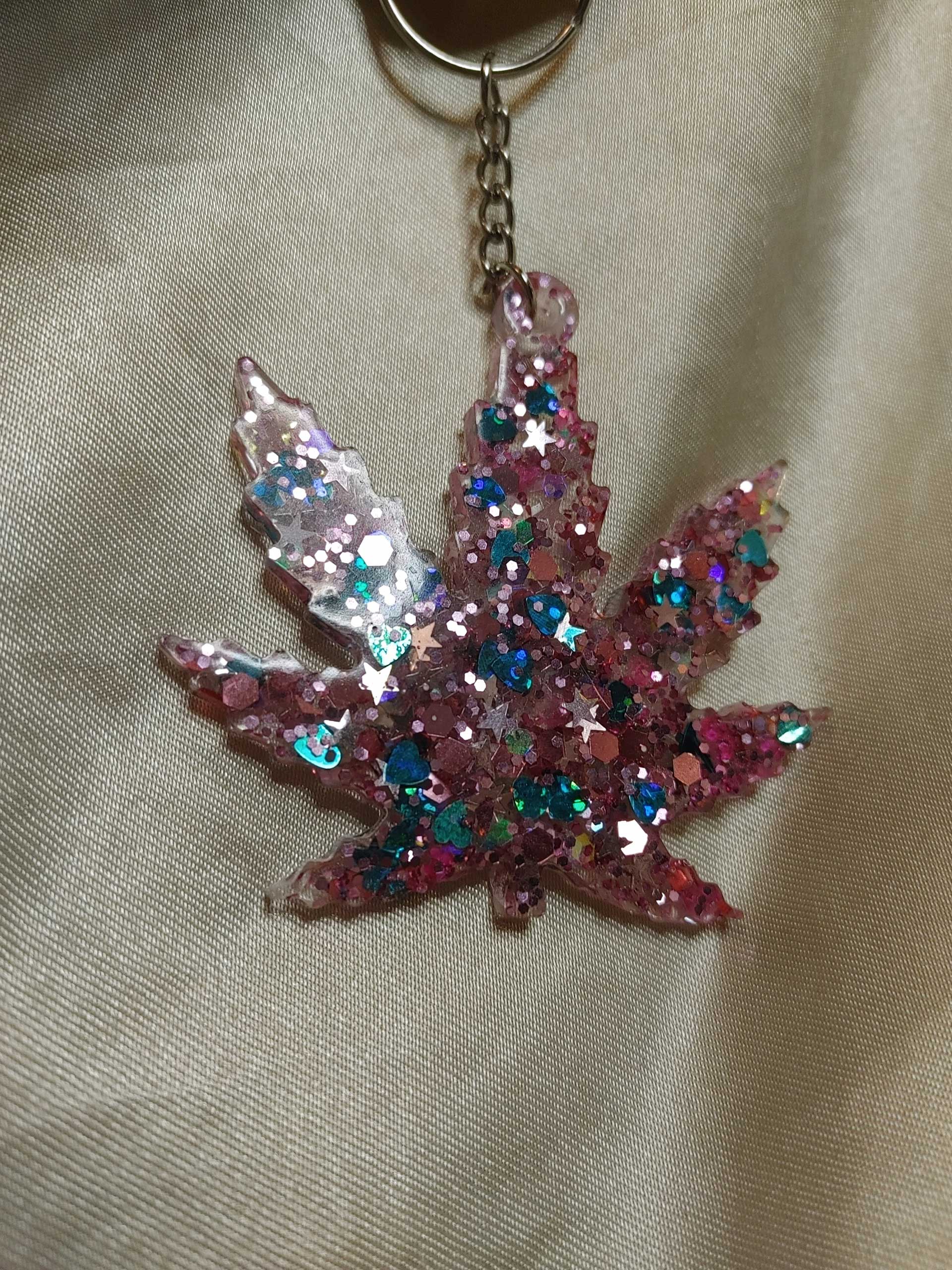 Molded resin marijuana leaf shape fob with embedded pink and teal glitters.