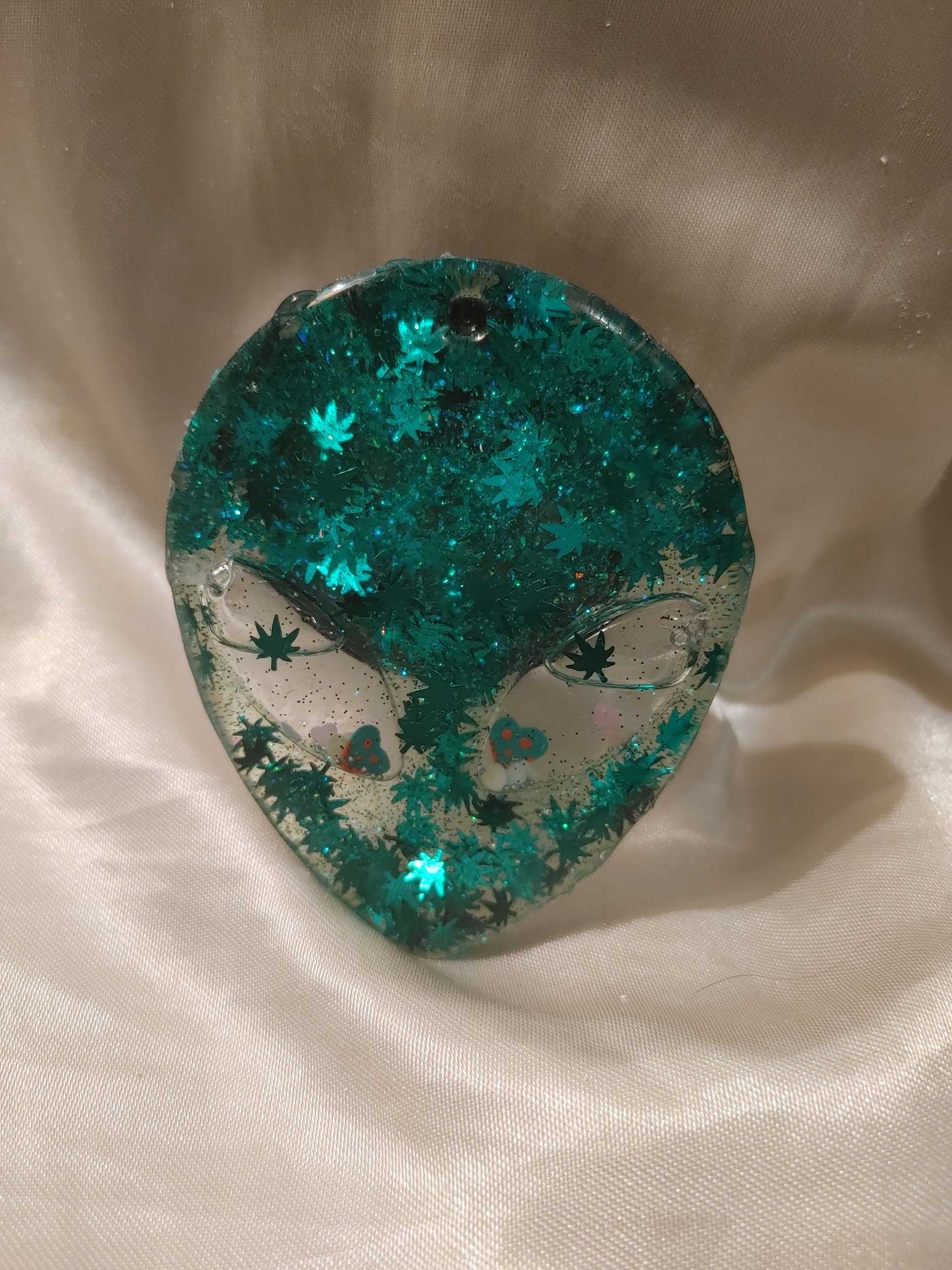 Molded resin alien head shape features marijuana leaf glitter, and poison apples and white hearts glitters in the eyes, suspended in baby oil. Give it a shake and watch it all dance around.