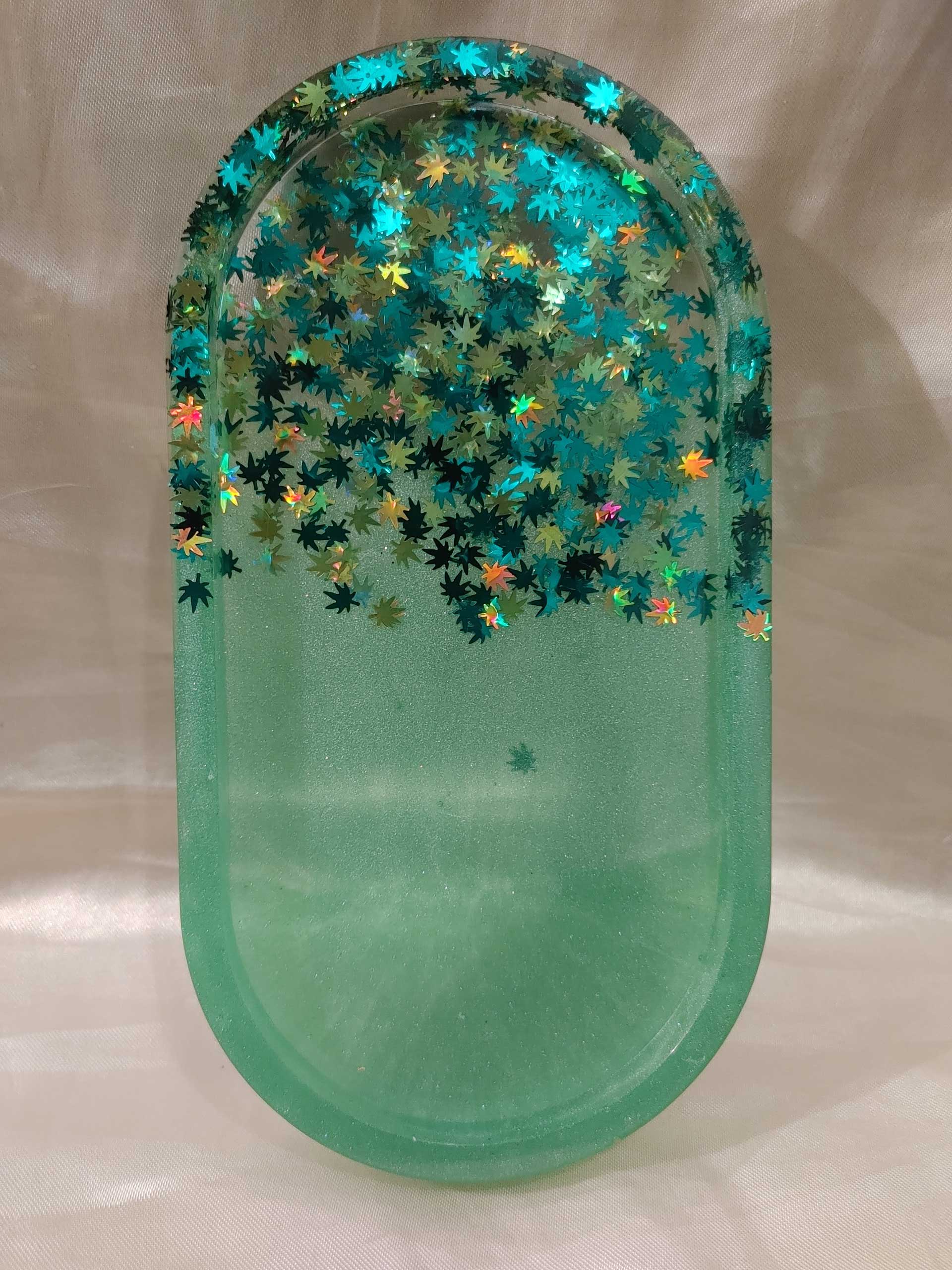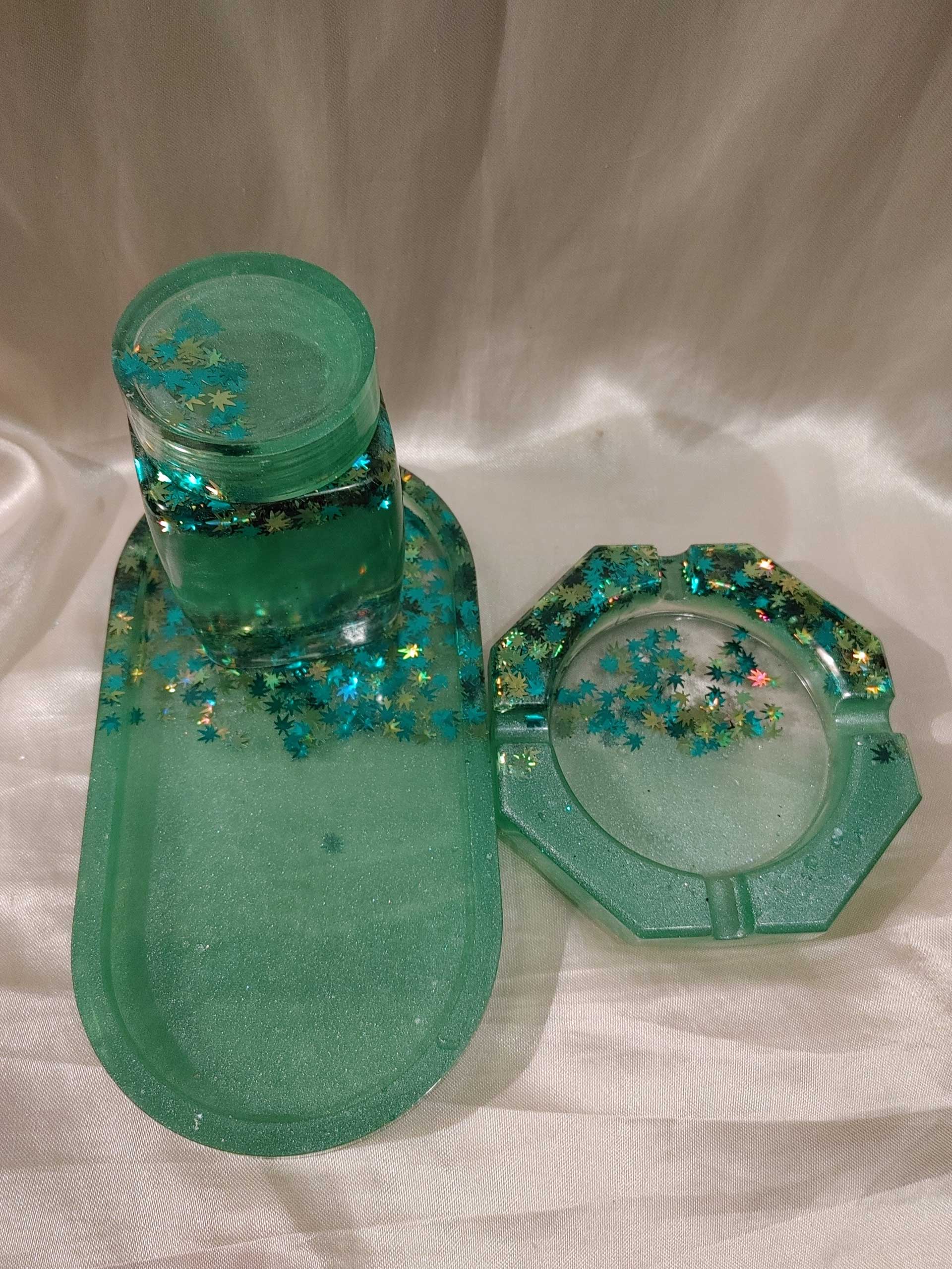 Molded resin rolling tray, stash jar and ashtray are with embedded green marijuana leaf glitter and treated with green mica powder for an iridescent sheen.