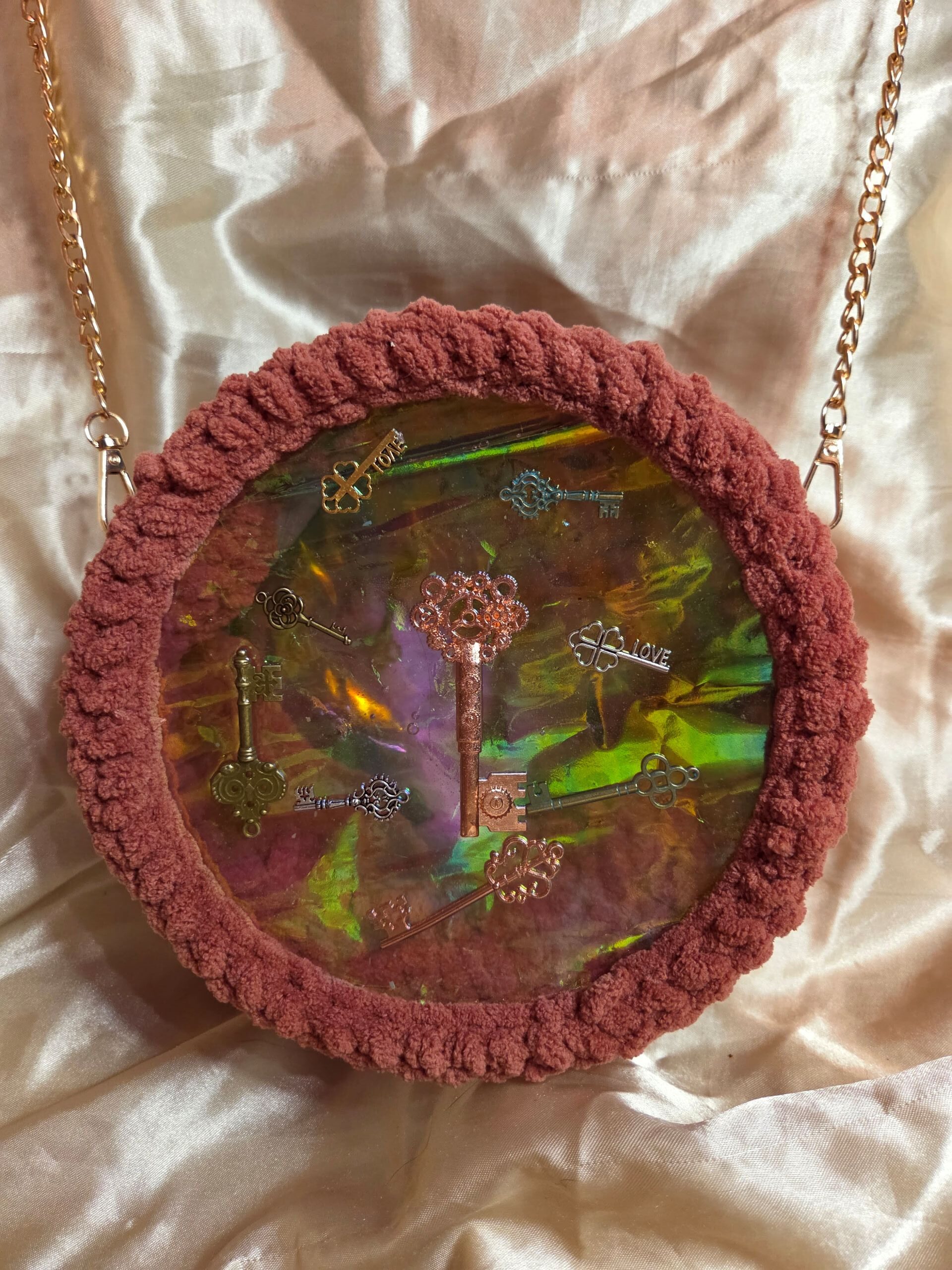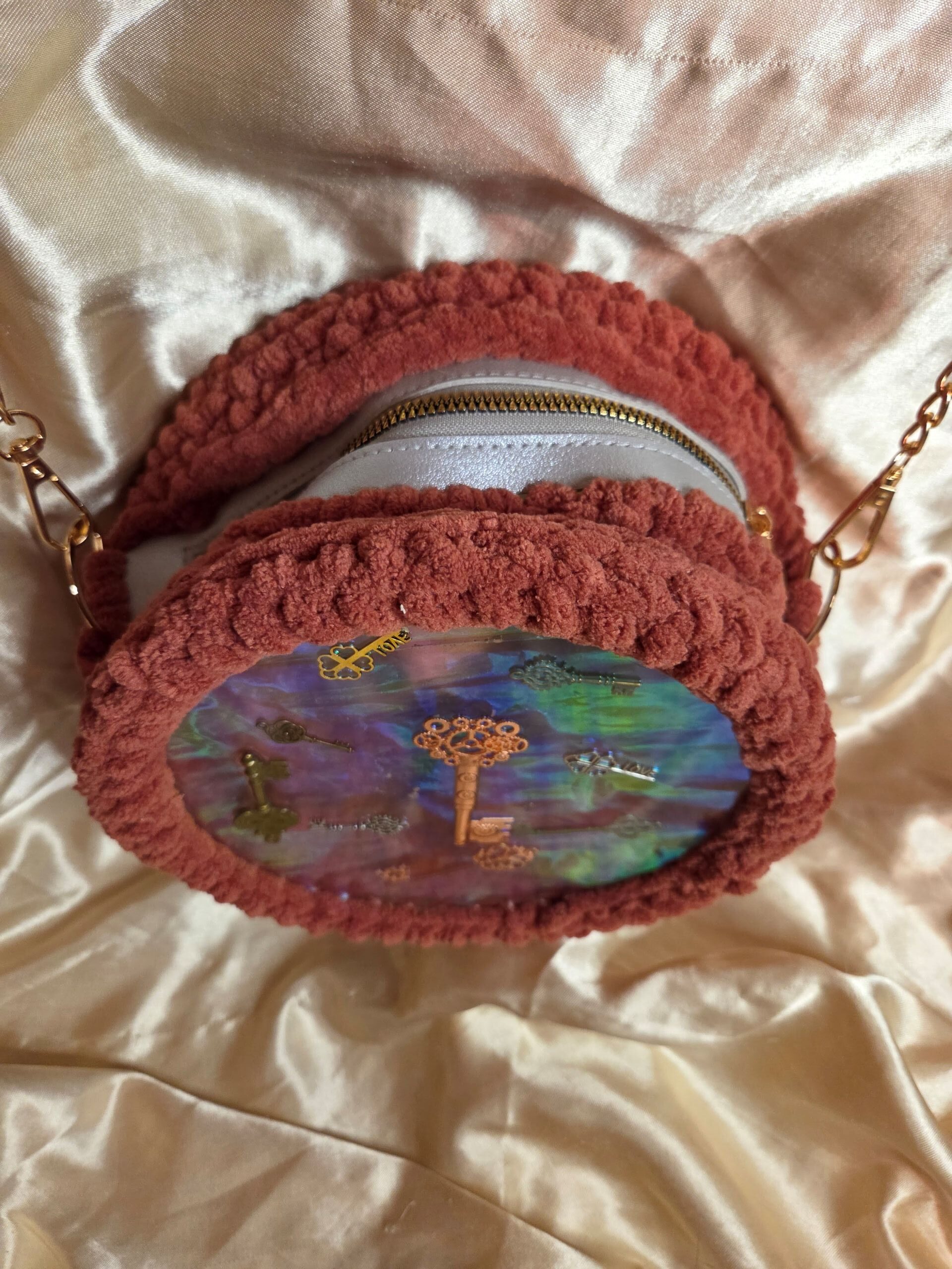 Windows are clear molded resin with holographic ribbon backing and embedded skeleton keys. Rust acrylic yarn.