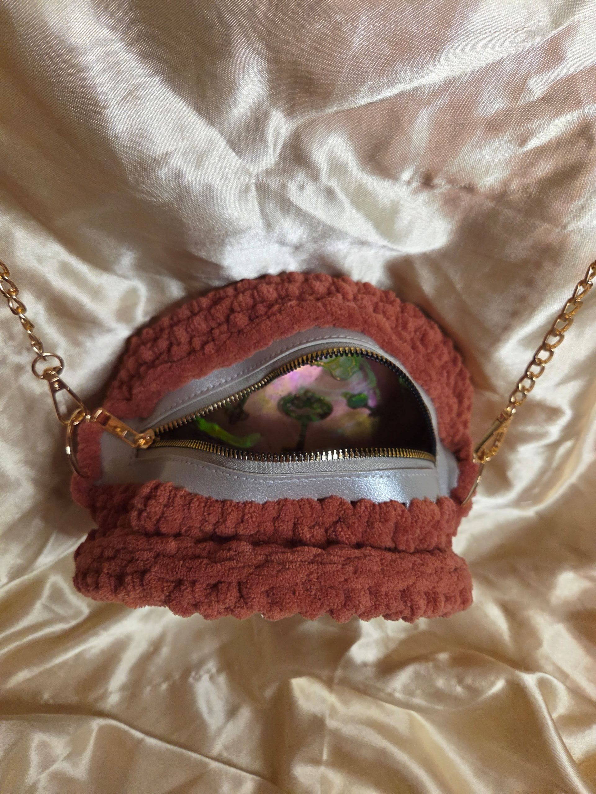 Crochet body with holographic ‘windows’ on each side this cute little purse features a gold tone chain and simulated leather strap with detachable lobster clip. Zipper close.