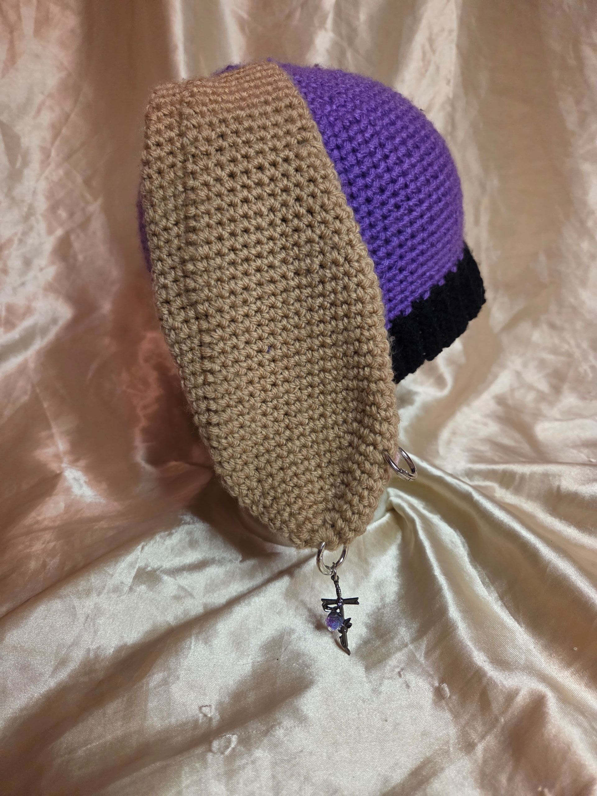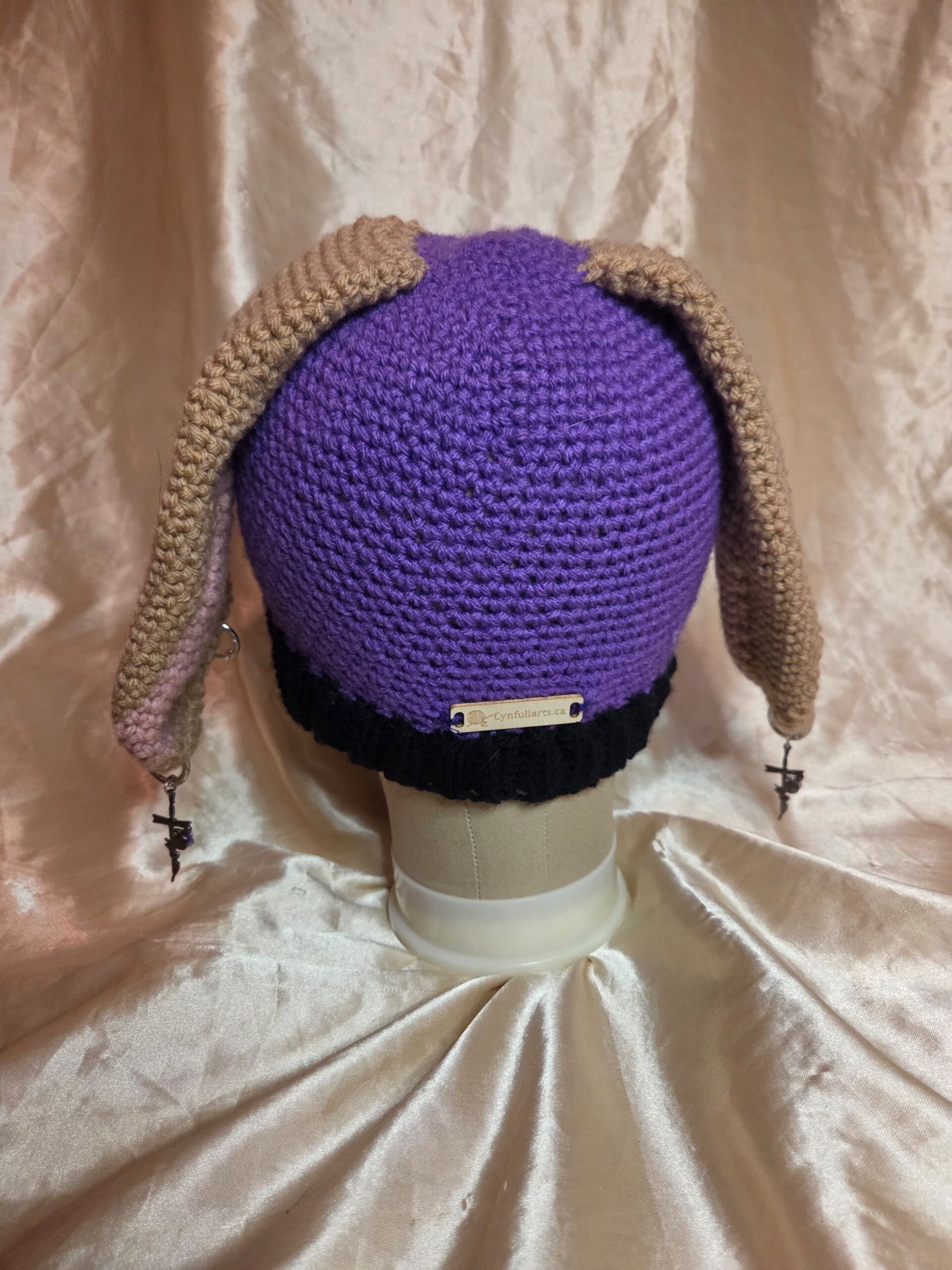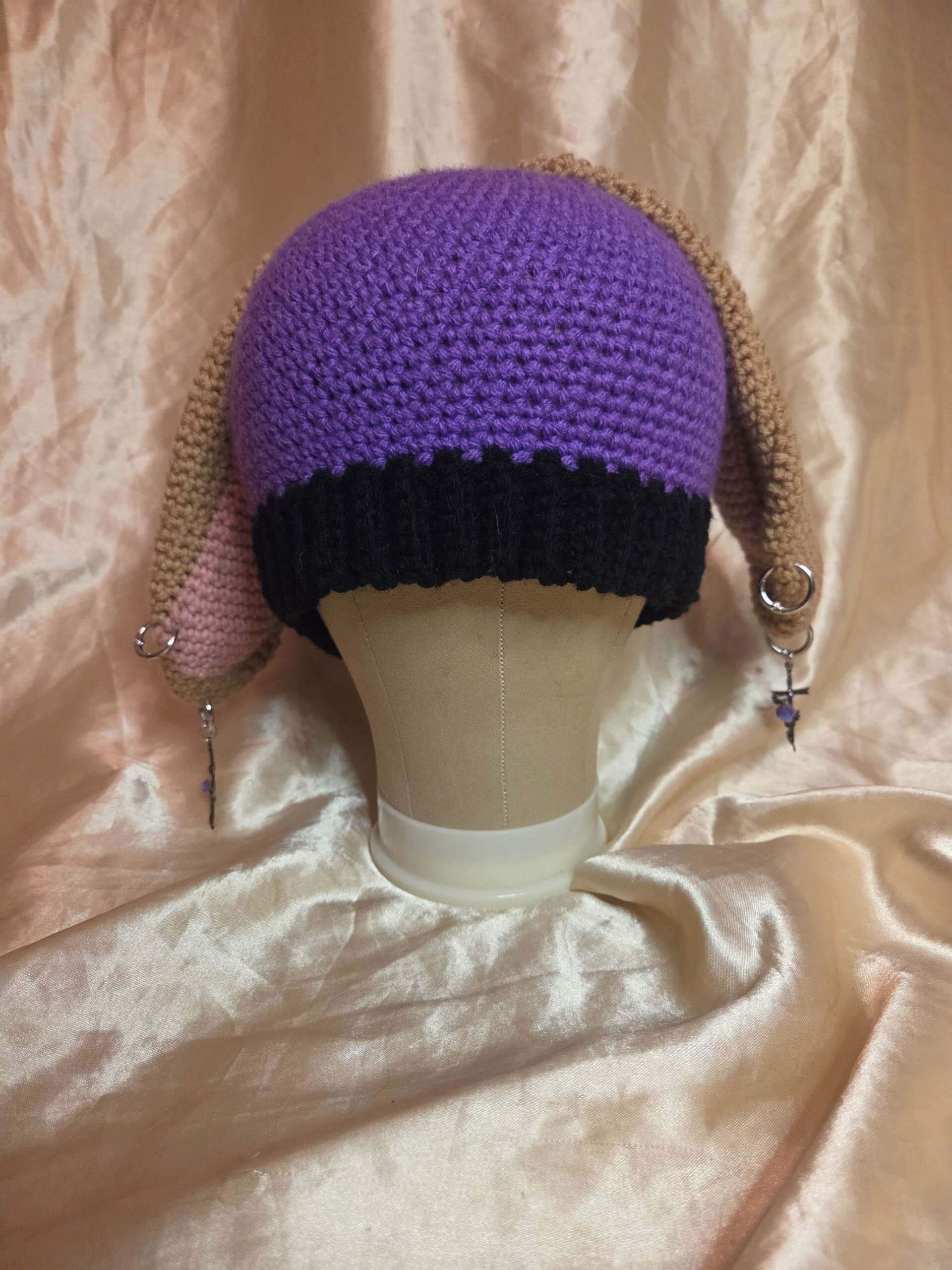 Hand crocheted hat is perfect for the colder months while adding some whimsy to your look! Made with 100% acrylic yarns, the stretchy purple cap features black/pink/light brown floppy ears and silver tone piercings.