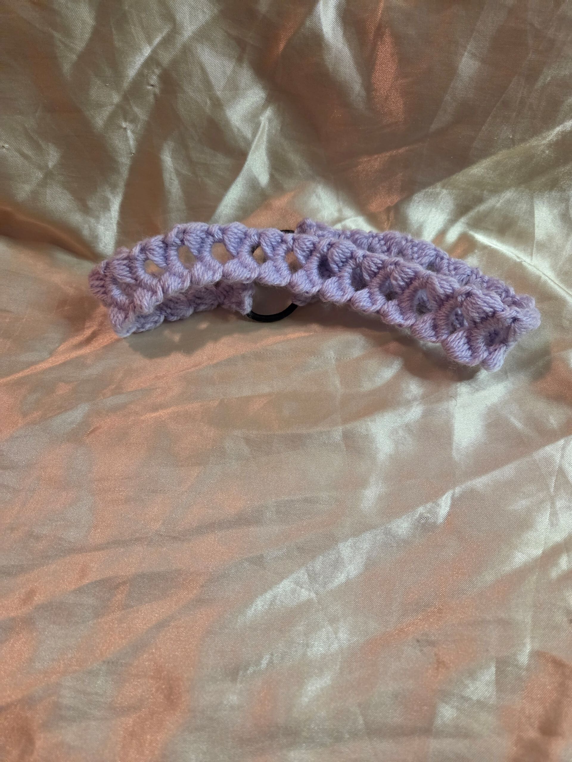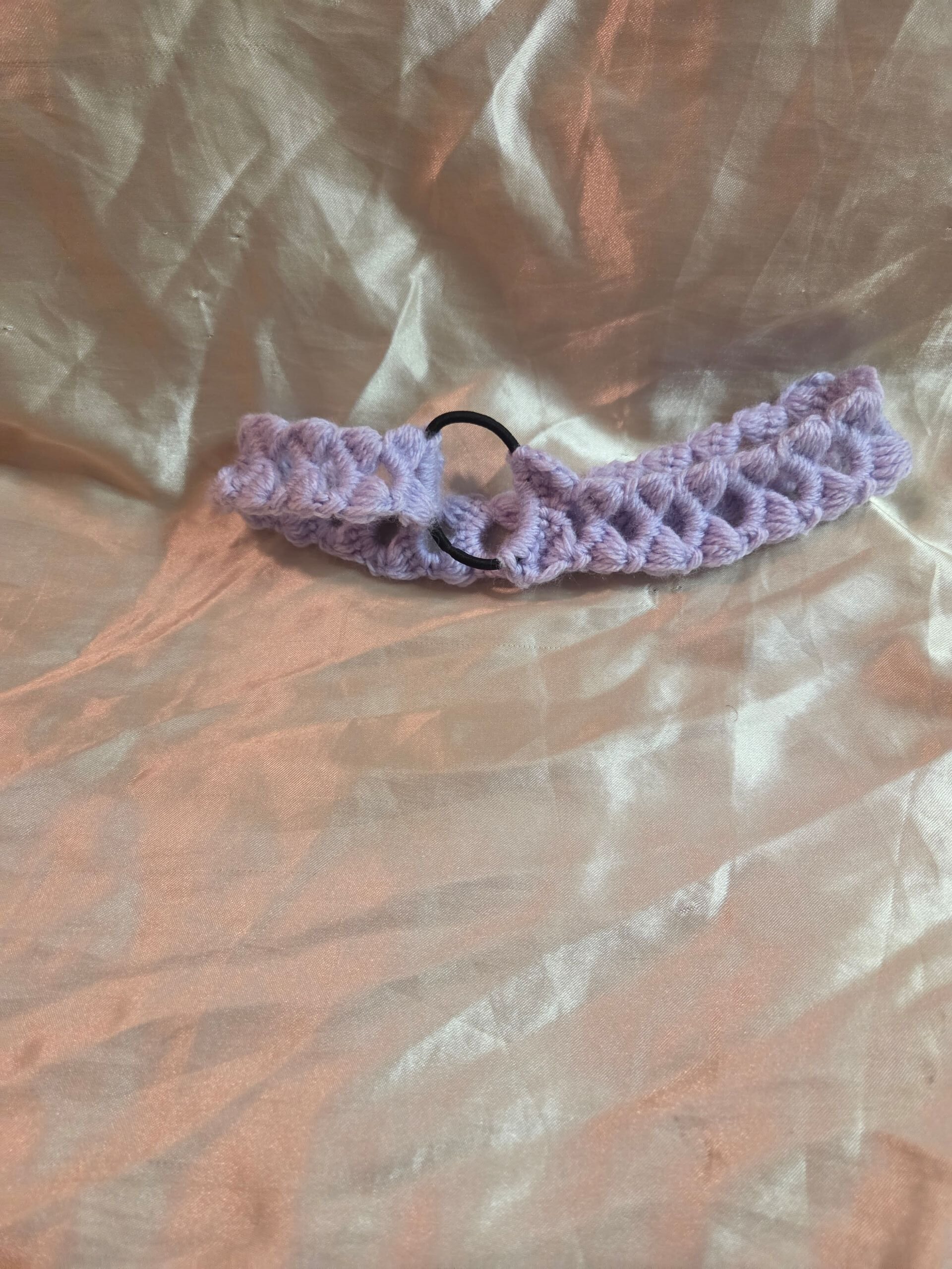 Hand crocheted with light purple acrylic yarn. Features stretchy elastic back. One size fits most adults.