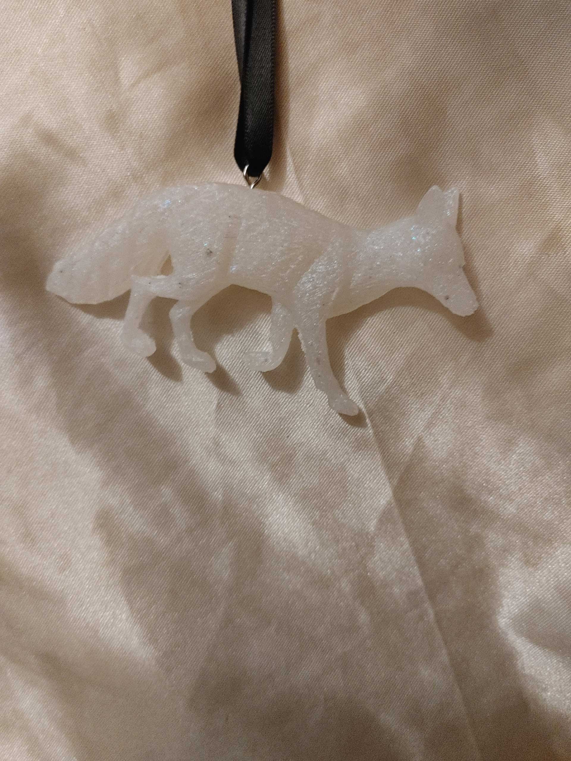 Molded resin ‘fox’ ornament with embedded white glitter is treated with white mica powder for iridescent sheen. Attached black ribbon for hanging.