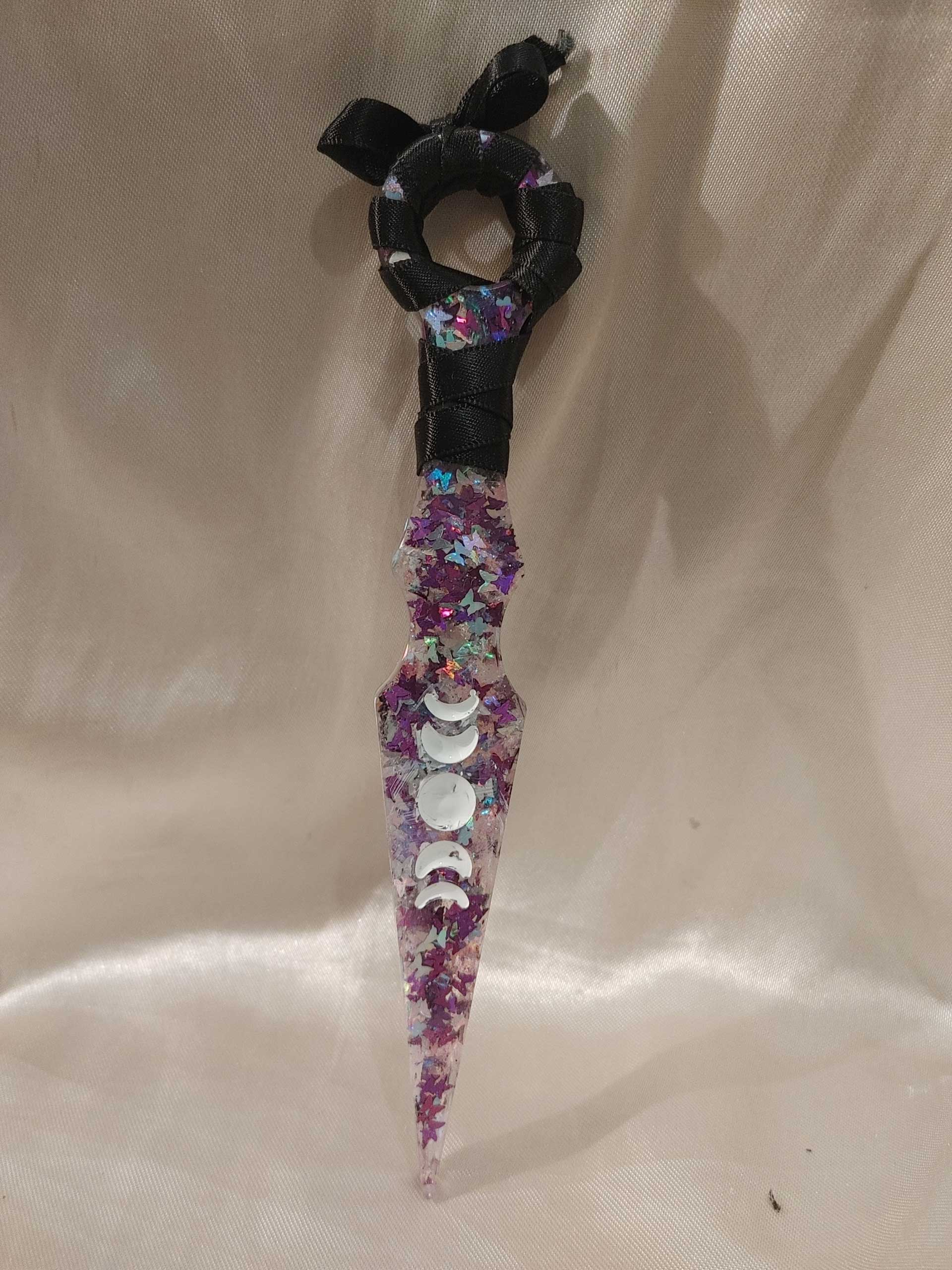 Molded resin decorative/ornamental dagger with embedded silver/purple butterfly glitter.