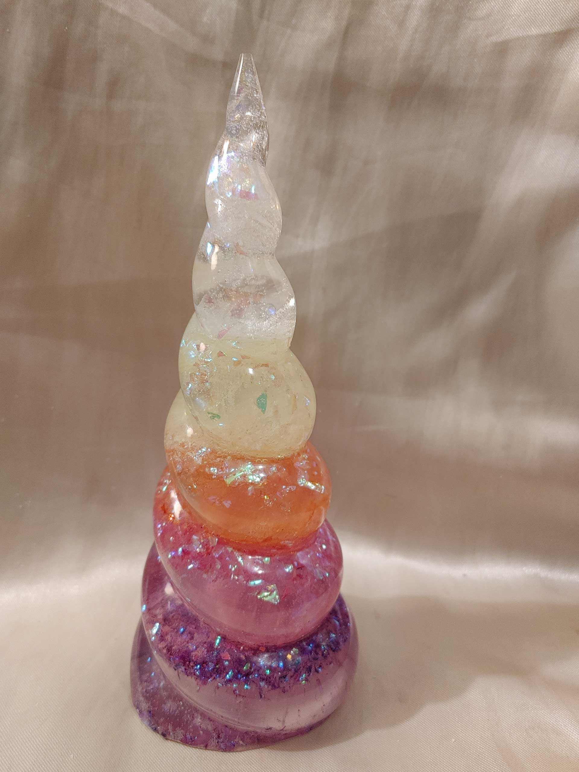 Molded resin unicorn horn shape with embedded white, yellow, orange, pink and purple holographic flakes in layers to create a sunrise effect.