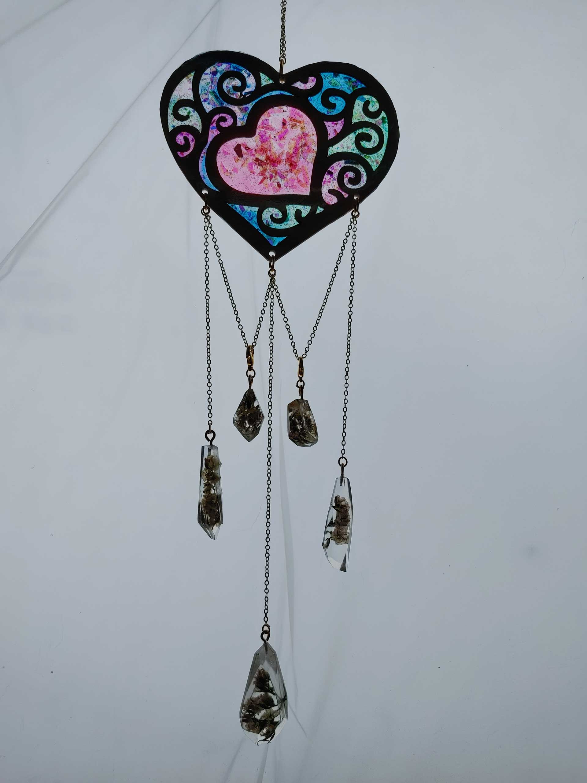 Cut-outs within the heart are filled with blue, green, purple and pink alcohol ink tinted resin and holographic flakes glitter to match the tints giving it a stained glass appearance. Molded resin ‘crystals’ with embedded dried flowers hang from the cut-out on gold tone chains. Attached gold tone chain for hanging.
