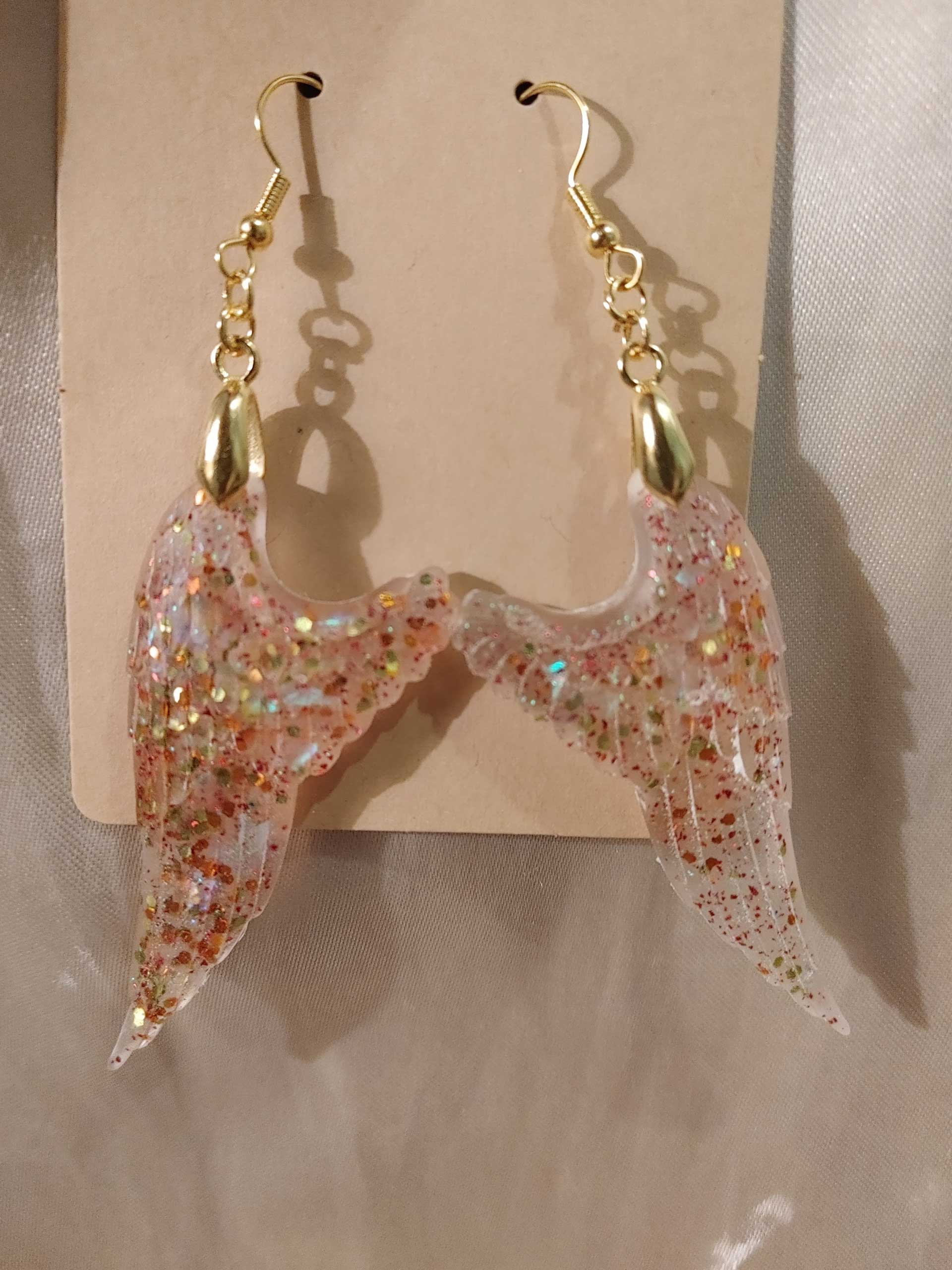 Wing shape drop style earrings (pair) for pierced ears. Molded resin with embedded red/orange glitter. Fish hook style posts.
