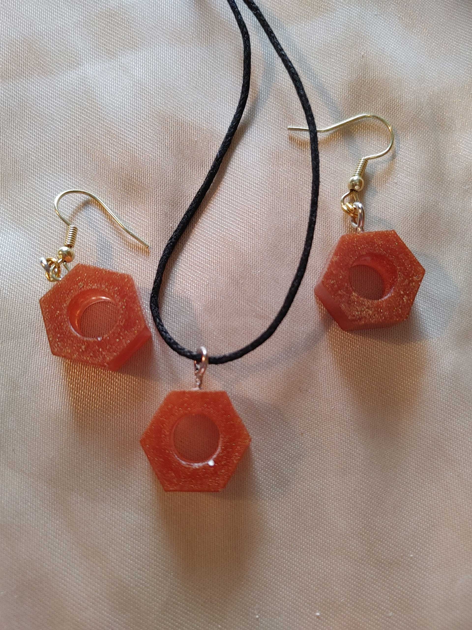 Molded bronze tinted resin pendants. Earrings (pair) for pierced ears have gold tone fish hook style posts.