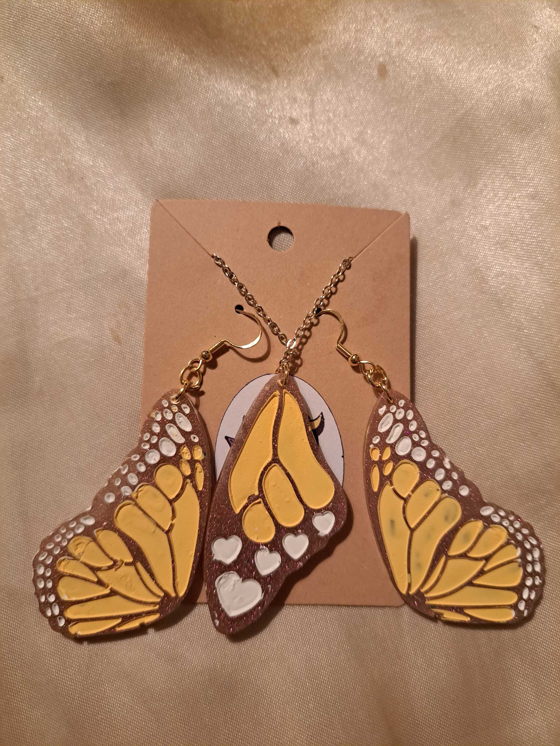 Molded gold mica powder tinted resin pendants with hand painted yellow/white accents. Mica powder gives iridescent sheen. Earrings (pair) for pierced ears have gold tone fish hook style posts.