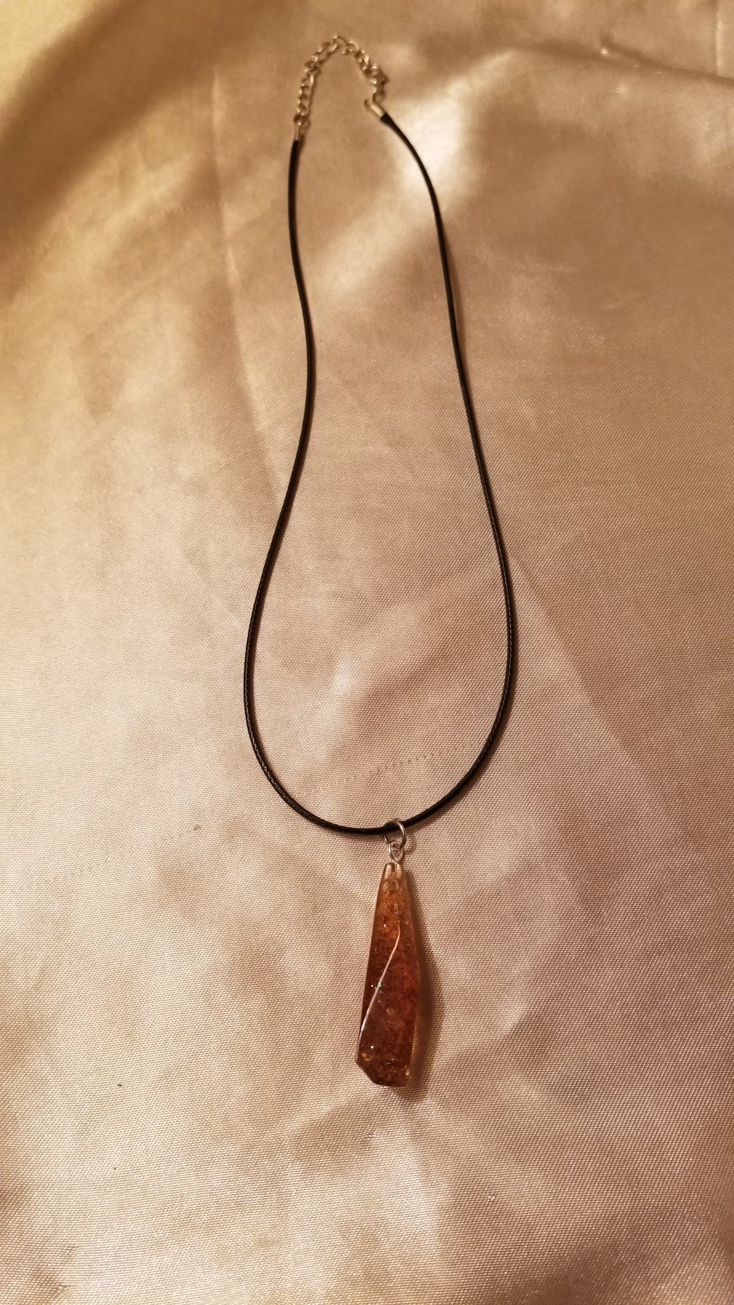 Molded resin crystal like pendant with embedded brown tone speckles.