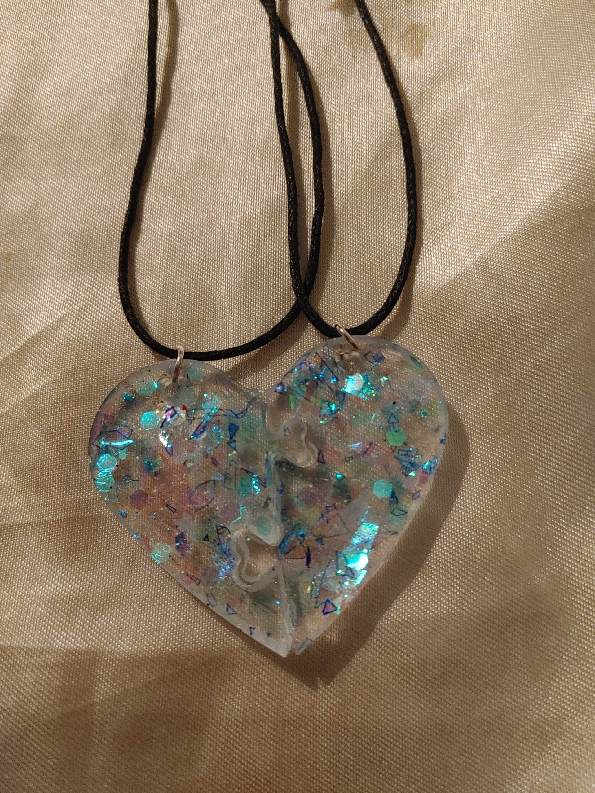 Molded clear resin interlocking heart friendship pendants with embedded blue holographic glitter. Each half heart is on its cord. Ready for sharing with someone special.