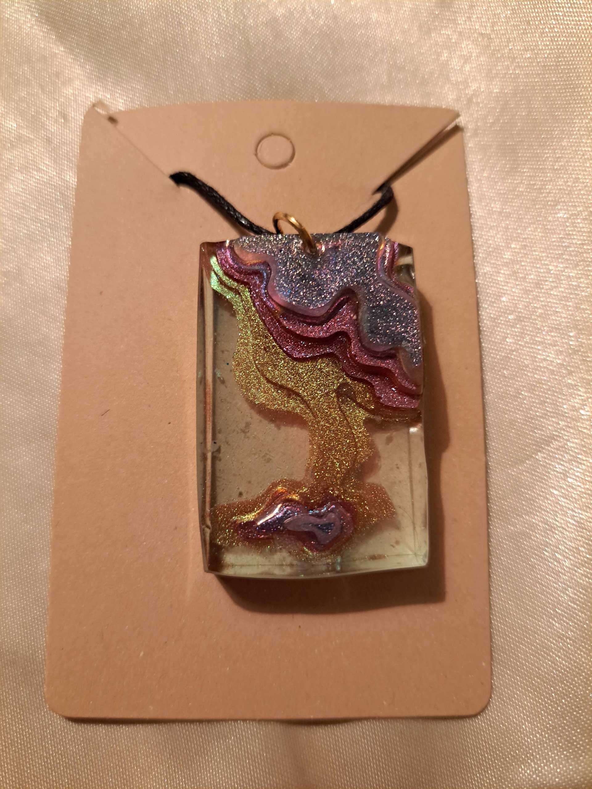 Molded grape/galaxy mica powder/gold colour shift tinted layered/clear resin pendant. Mica powder gives iridescent sheen.