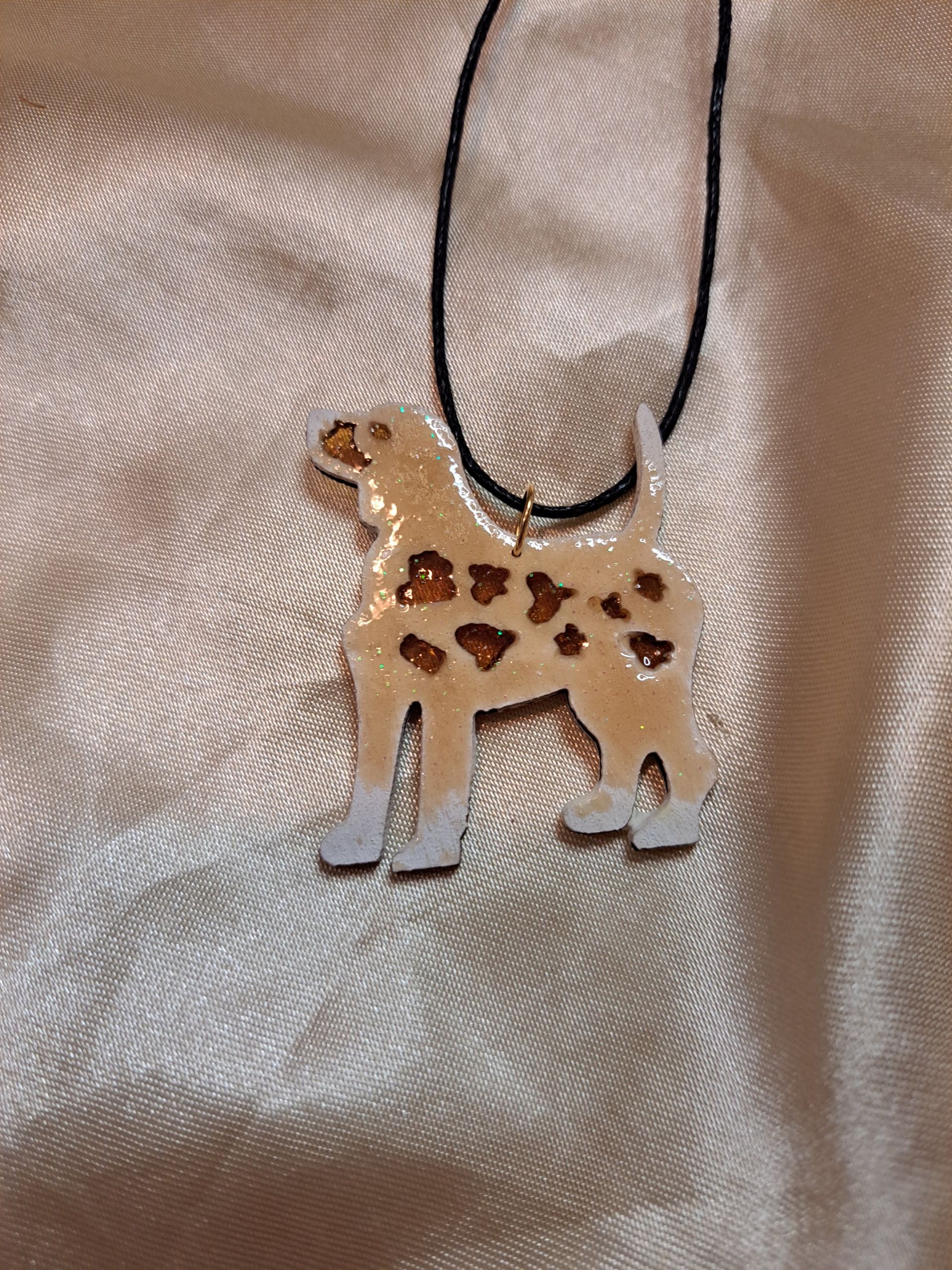 Wood dog shape pendant painted with white/brown acrylic and coated/filled with a layer of brown alcohol ink tinted UV resin to create a stained glass effect and add all over shine.