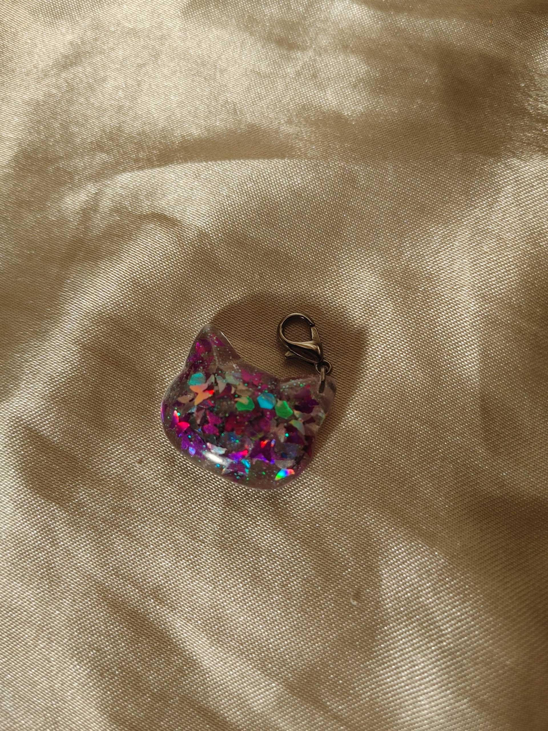 Molded resin with embedded purple/silver butterfly glitter. Attached ‘lobster clasp’ for easy on and off.