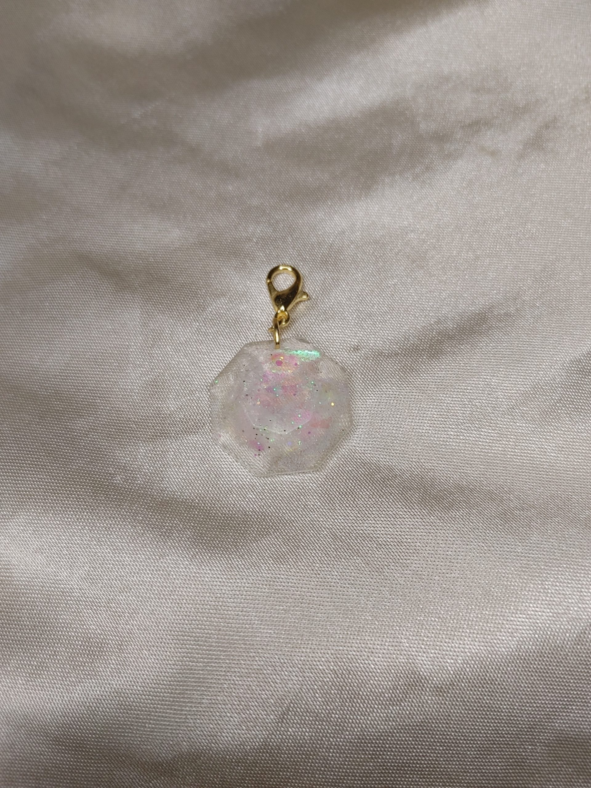 Molded resin cut jewel design crystal like appearance with embedded white holographic flakes. Attached ‘lobster clasp’ for easy on and off.