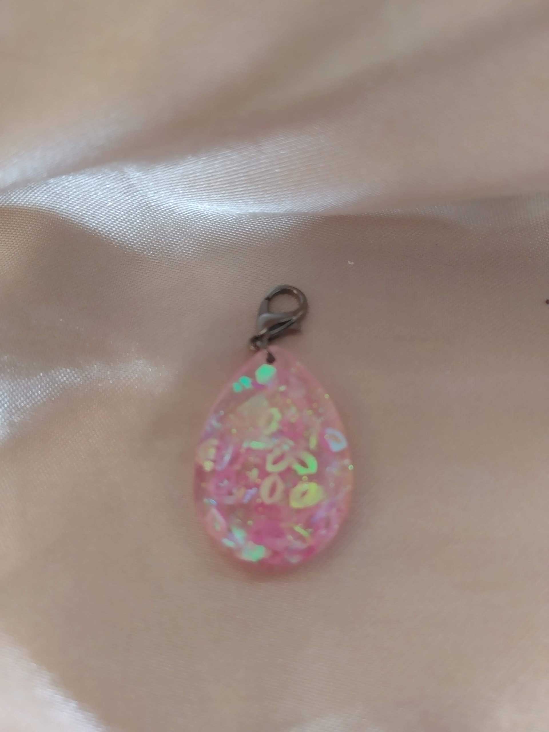 Molded ‘jewel cut’ resin with embedded pink lip glitter. Attached ‘lobster clasp’ for easy on and off.