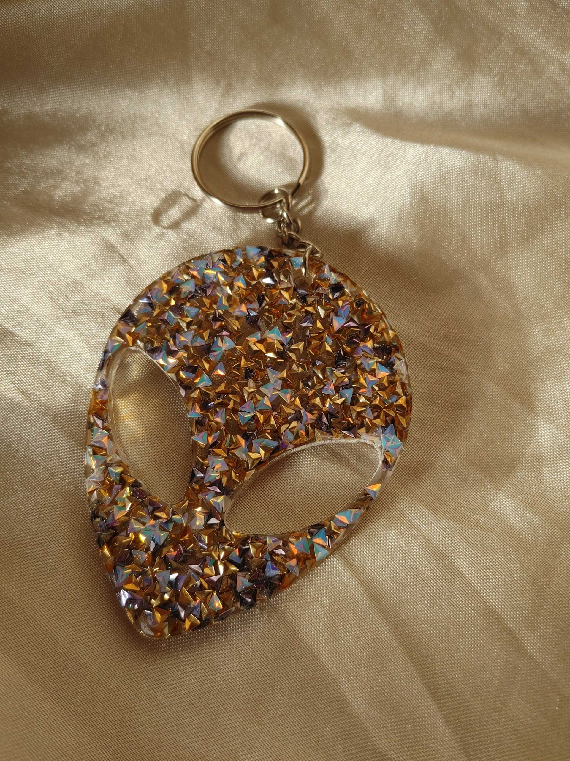 Molded resin ‘alien head’ with embedded gold/white/purple 3D triangles glitter.