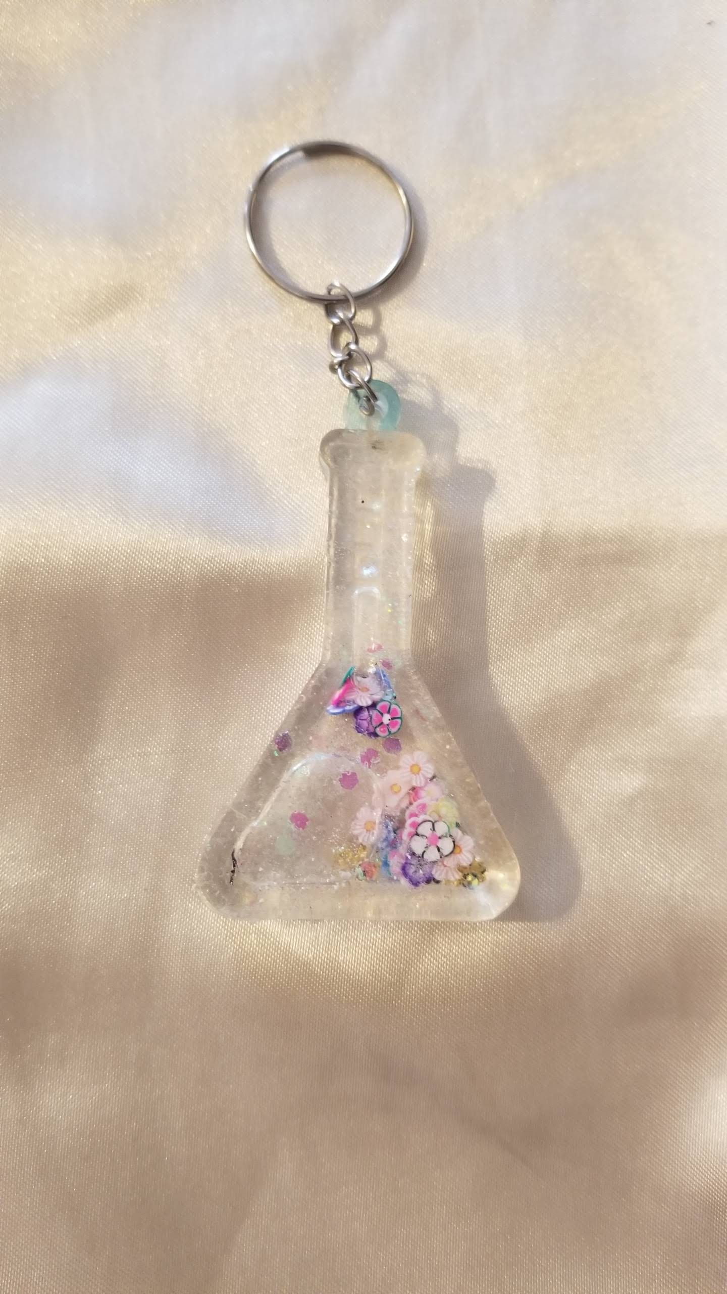Molded resin beaker shaped fob. Shaker features flower confetti suspended in baby oil. Give it a shake and watch it all dance around.