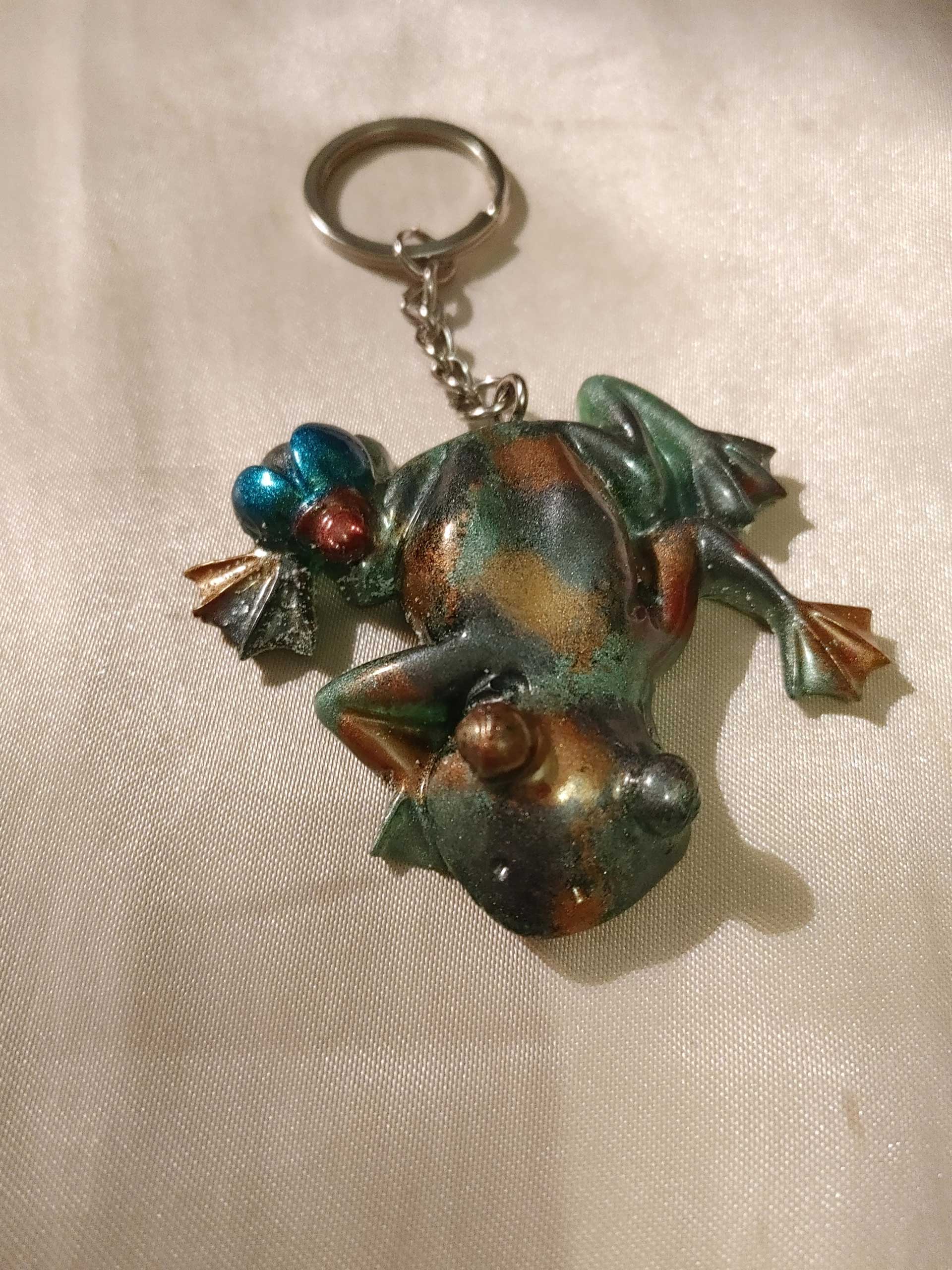 Molded green/black/bronze/copper mica powder (for iridescent sheen) tinted resin fob is mixed to create a camo effect.