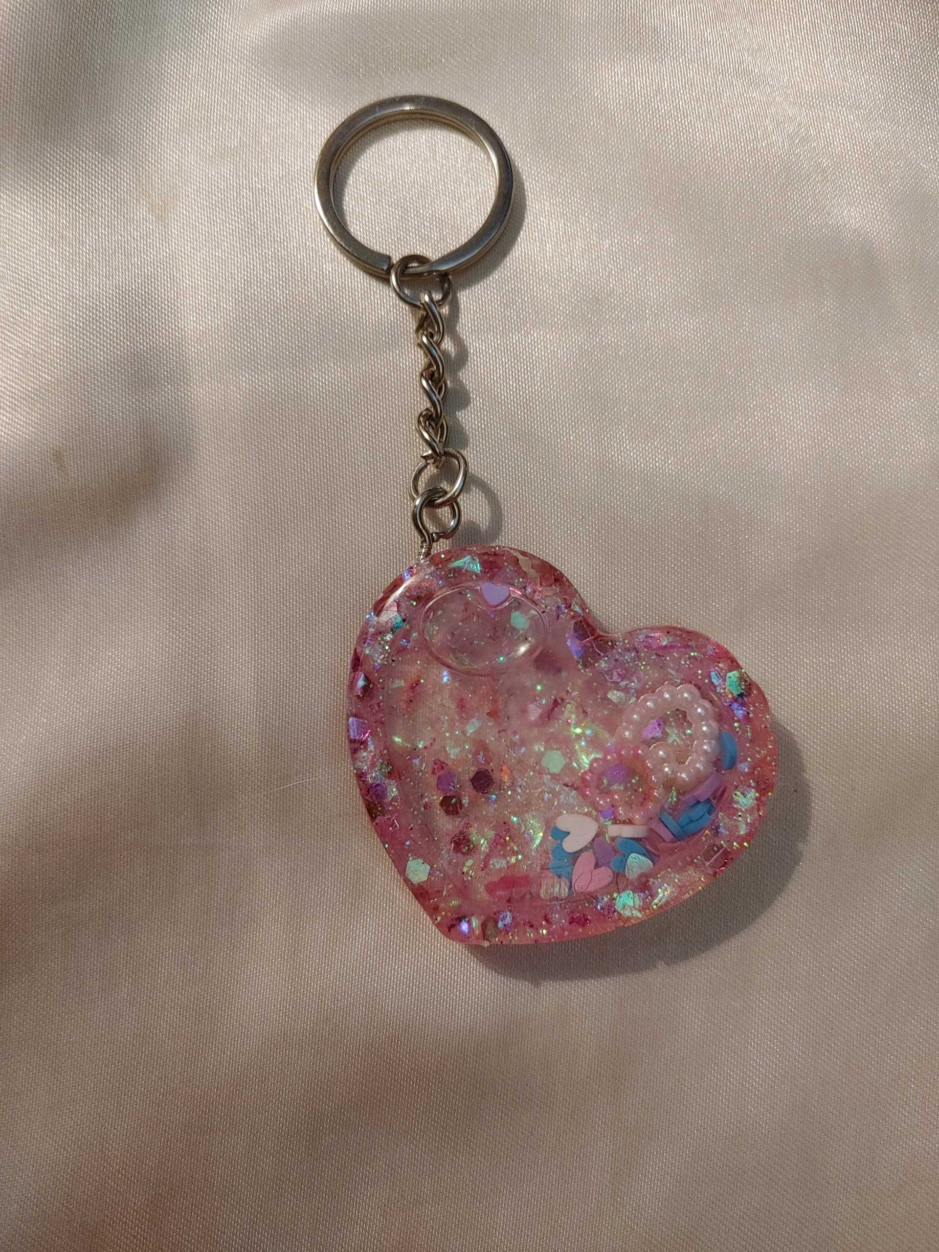 Molded resin heart shape fob with embedded pink holographic glitter in the frame. Shaker features heart glitter suspended in baby oil. Give it a shake and watch it all dance around.
