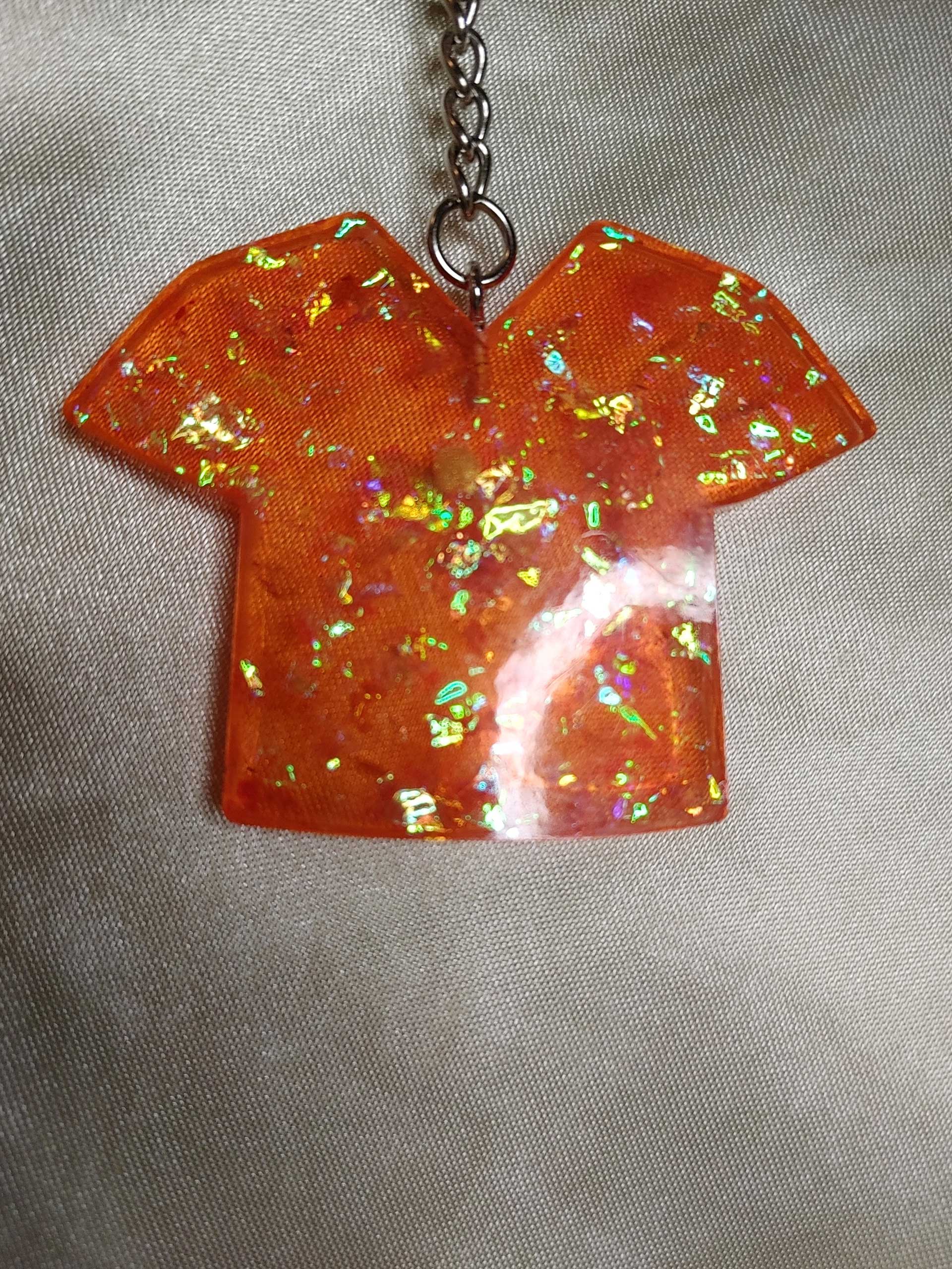 Molded orange tinted resin fob with embedded orange holographic flakes.