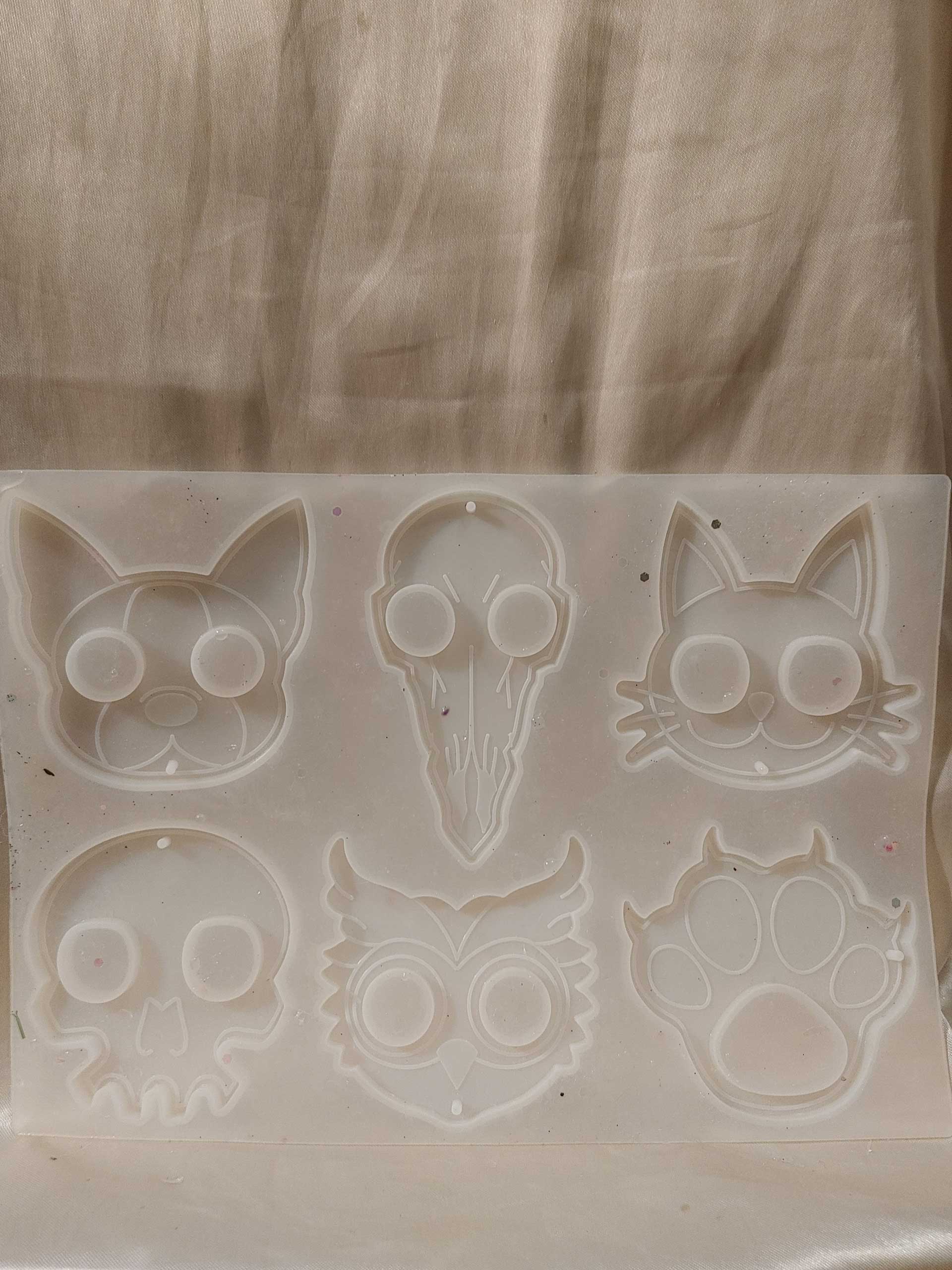 Mold for use with epoxy resin or similar materials to create 6 keychain fobs of various designs.