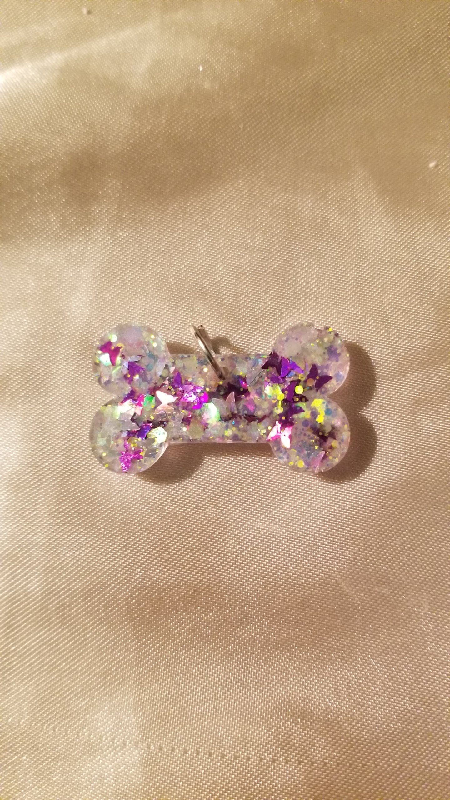 Molded resin bone shaped collar tag with embedded purple butterflies glitter and UV colour changing glitter. Place the tag in the sun or other UV light source and watch the white glitter magically change to pink!