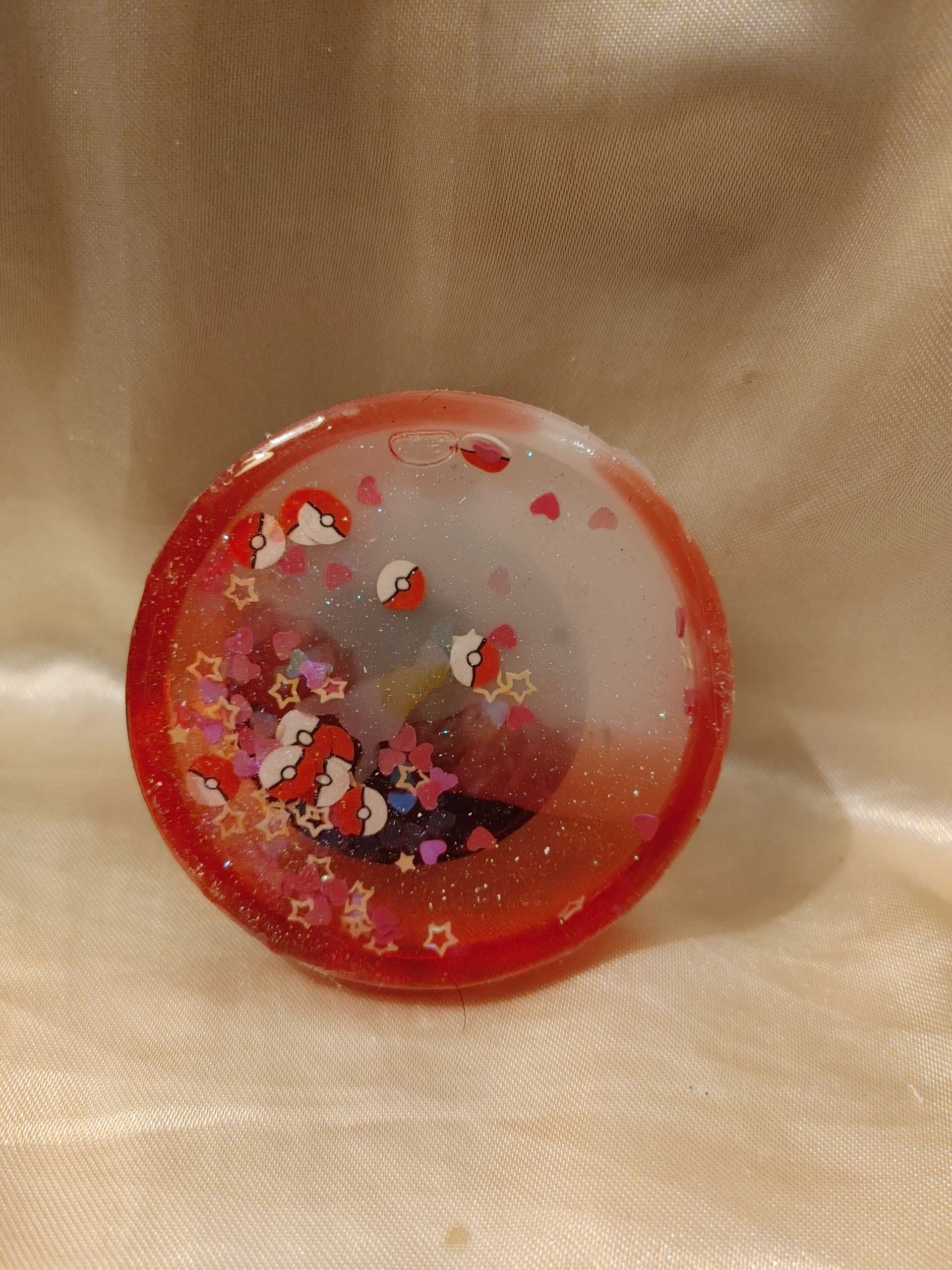 Molded red tinted resin circle shape features Pokeball, pink hearts and yellow stars glitters suspended in baby oil. Give it a shake and watch it all dance around.