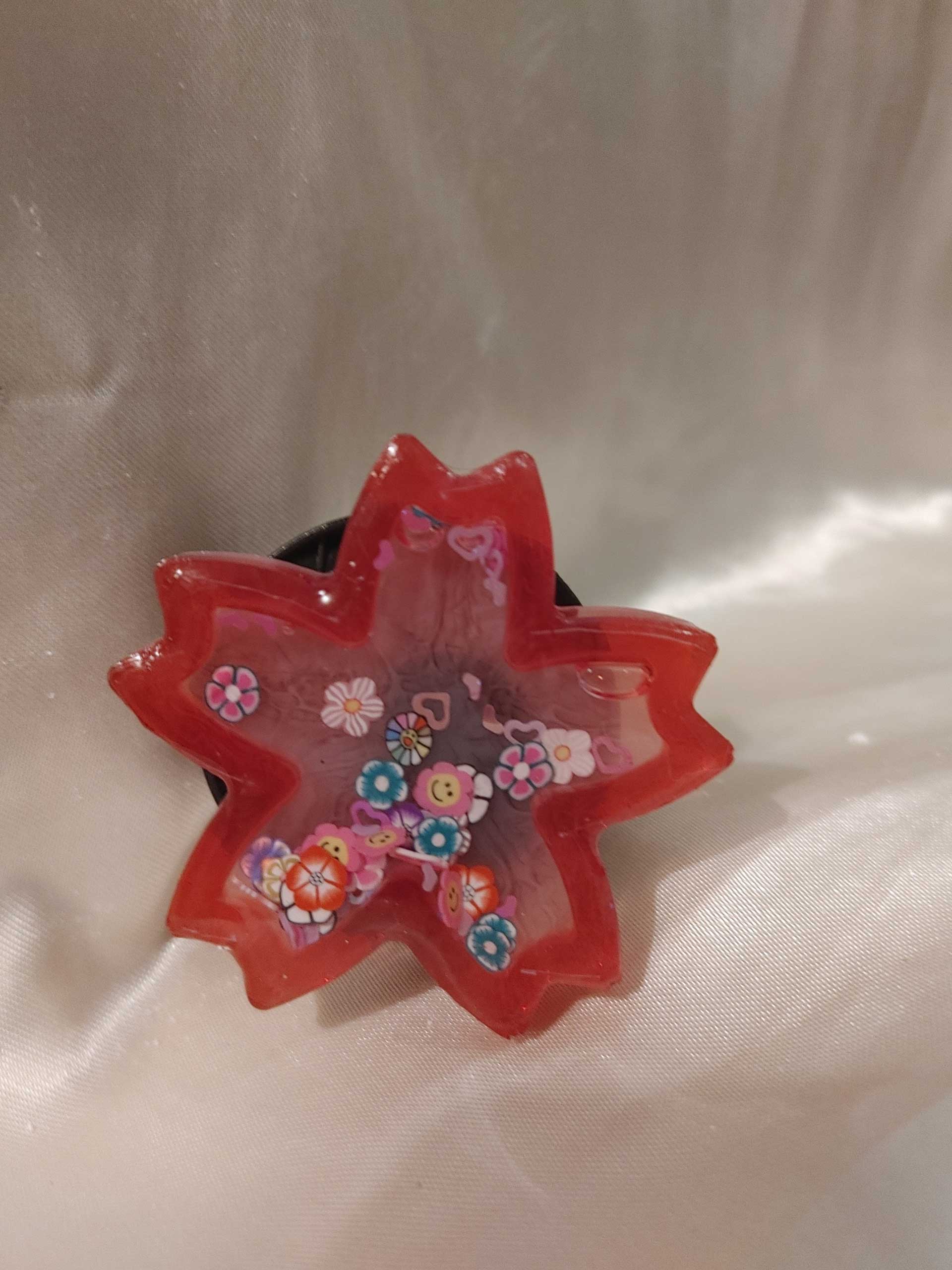 Molded red tinted resin flower shape features flowers and pink hearts glitter suspended in baby oil. Give it a shake and watch it all dance around.