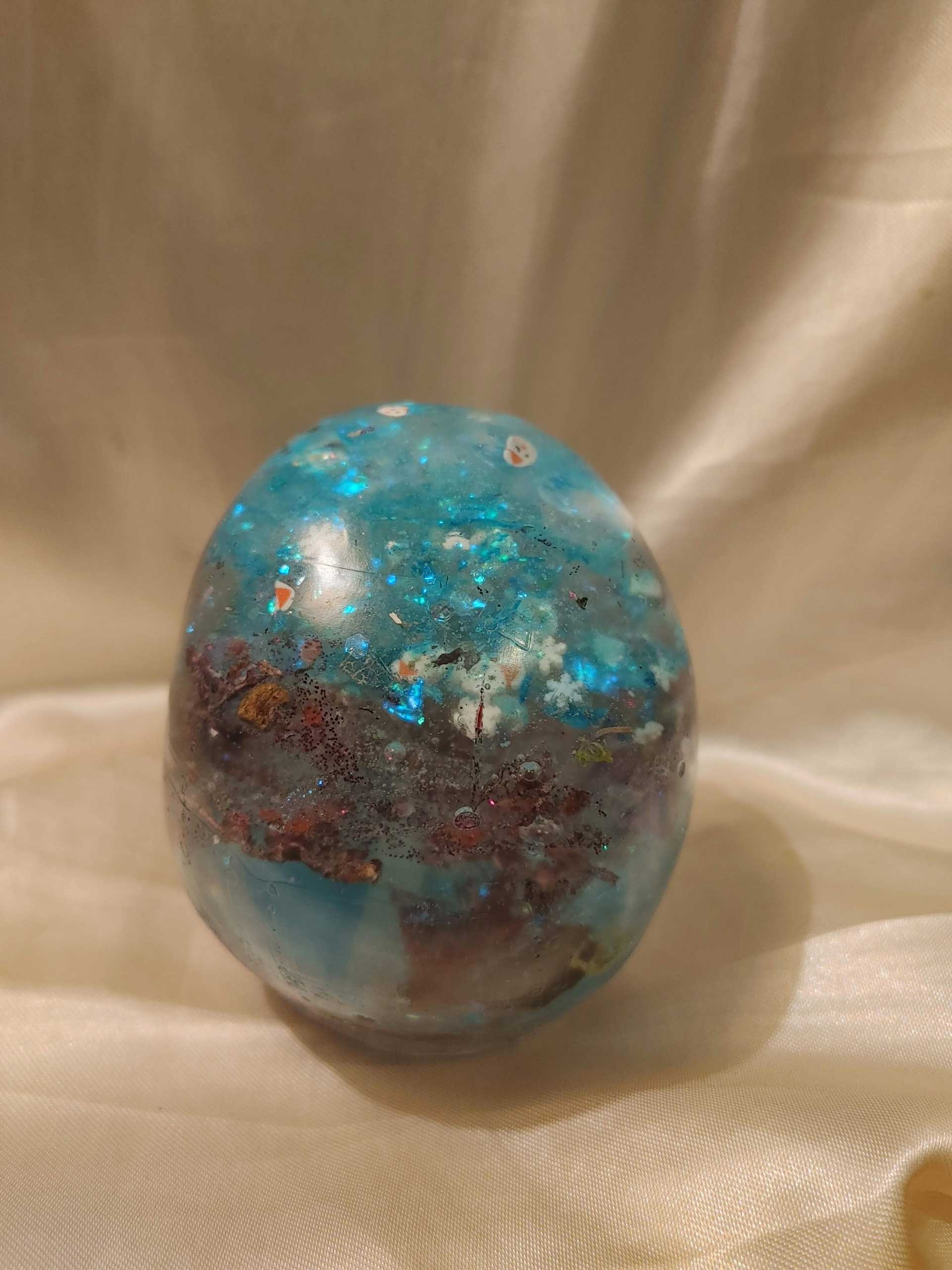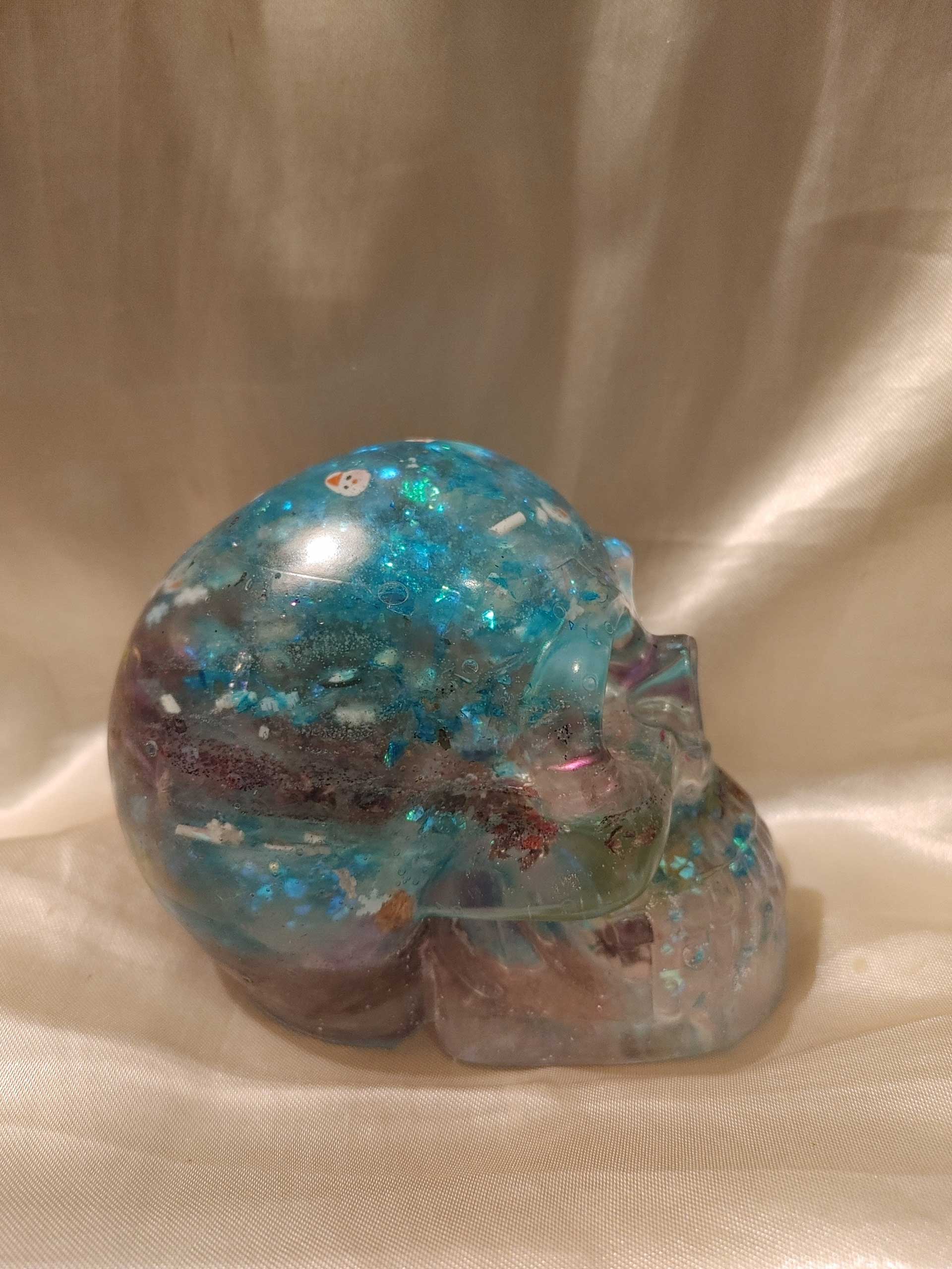Molded resin skull shape is with embedded recycled resin from trimmings, and projects that didn’t turn out so well that have been broken into bits and pieces, and layered in blues and purples.