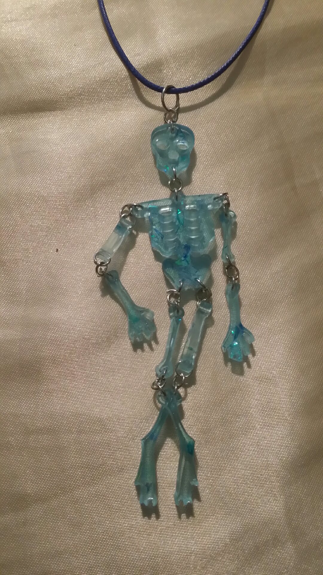 Molded blue tinted resin skeleton pendant. ‘Bones’ are held together with silver rings allowing limbs to move freely. Approx. 4-1/2″ tall.