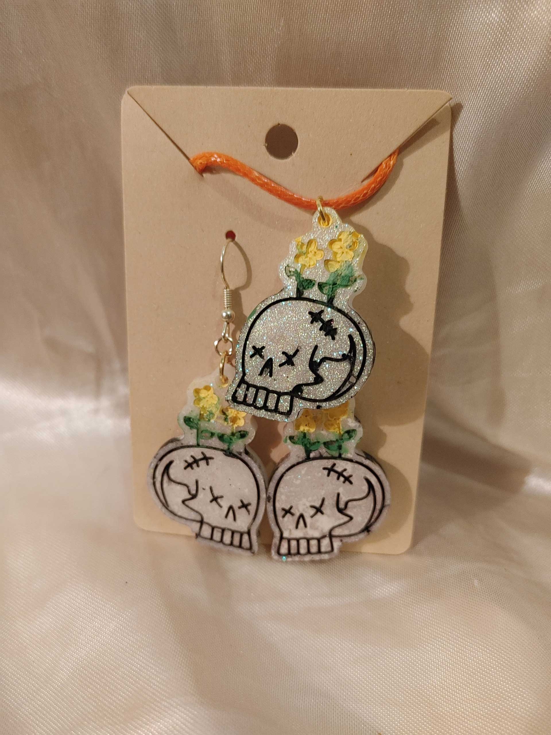 Skull shape pendant and drop style earrings (pair) for pierced ears. Molded resin with embedded fine white glitter treated with white mica powder for iridescent sheen. Earrings (pair) for pierced ears have fish hook style posts.