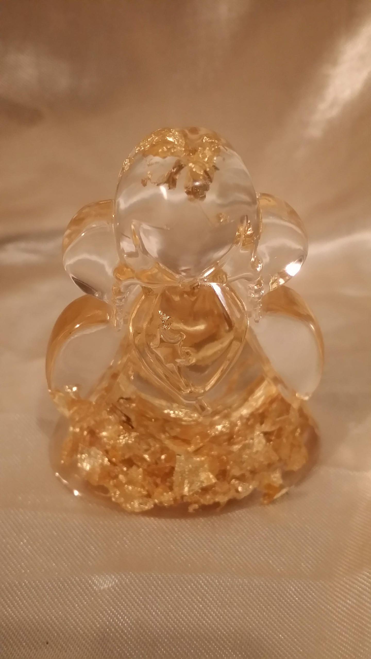 Molded resin angel figurine with embedded gold flakes.