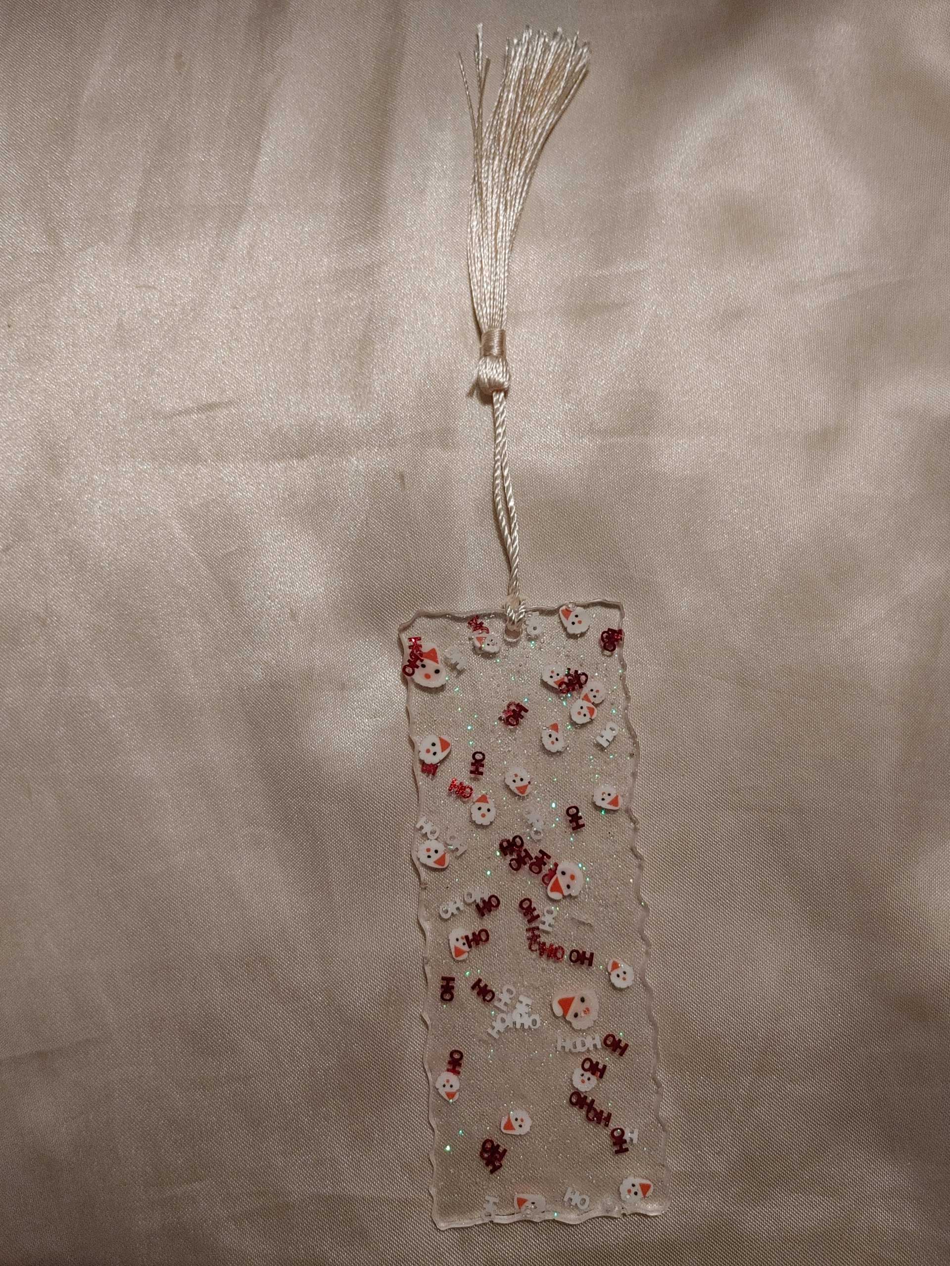 Molded resin features scalloped edges with embedded Santa, Ho Ho, and white glitter. Attached white tassel.