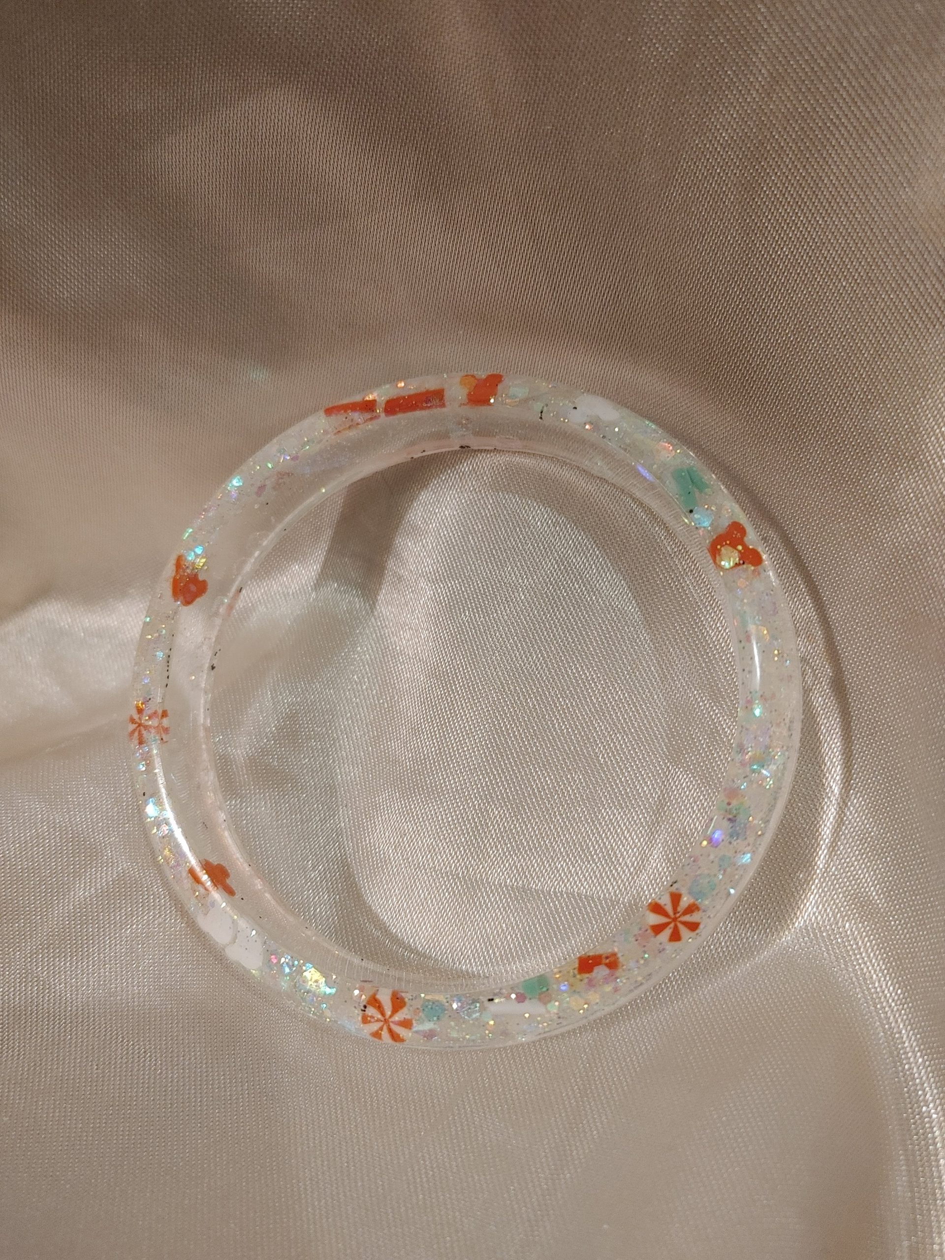 Molded resin bangle style bracelet with embedded red/white mouse, peppermint candy and white glitter.
