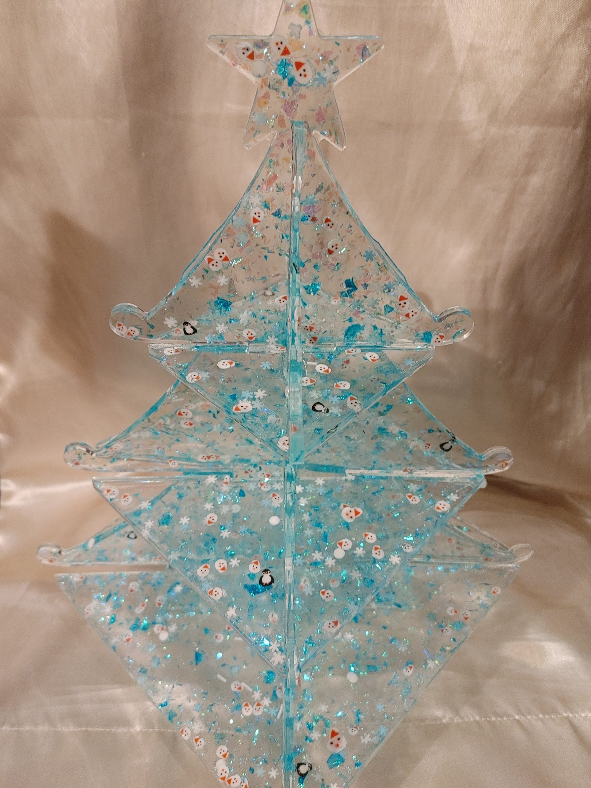 Molded resin Christmas Tree treat/ornament stand with embedded white/blue holographic flakes and Santa, penguin and snowflakes glitter.